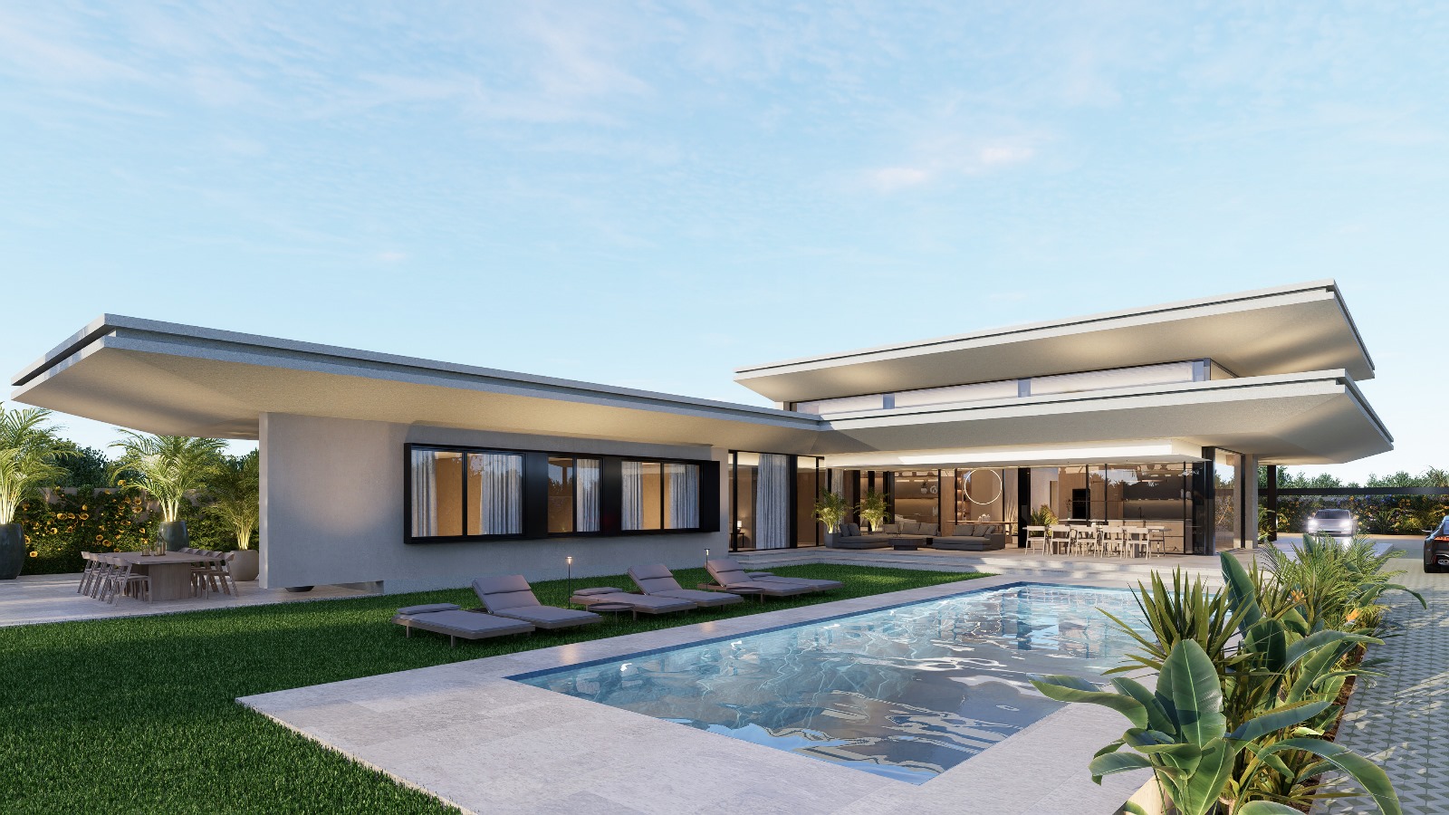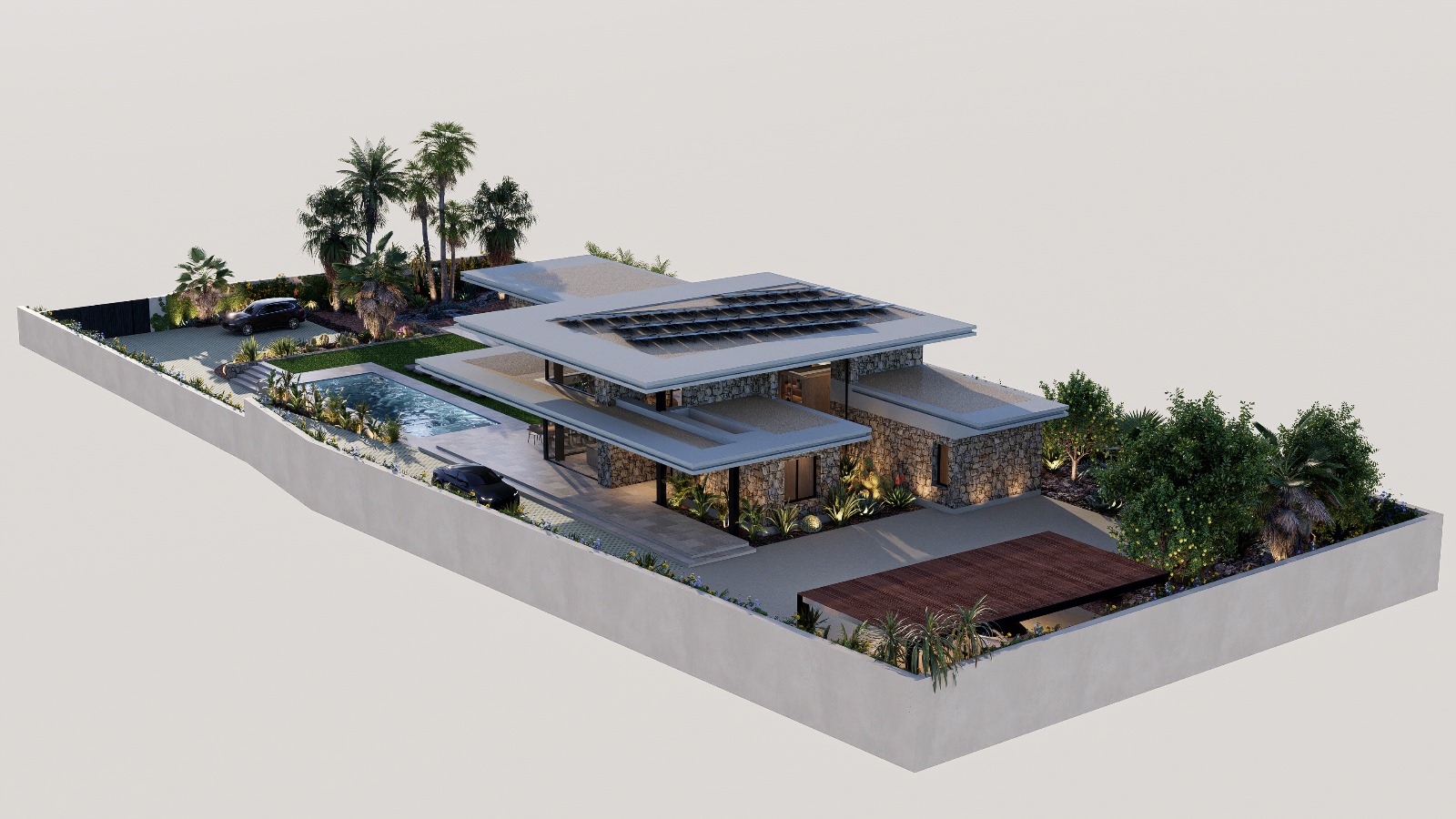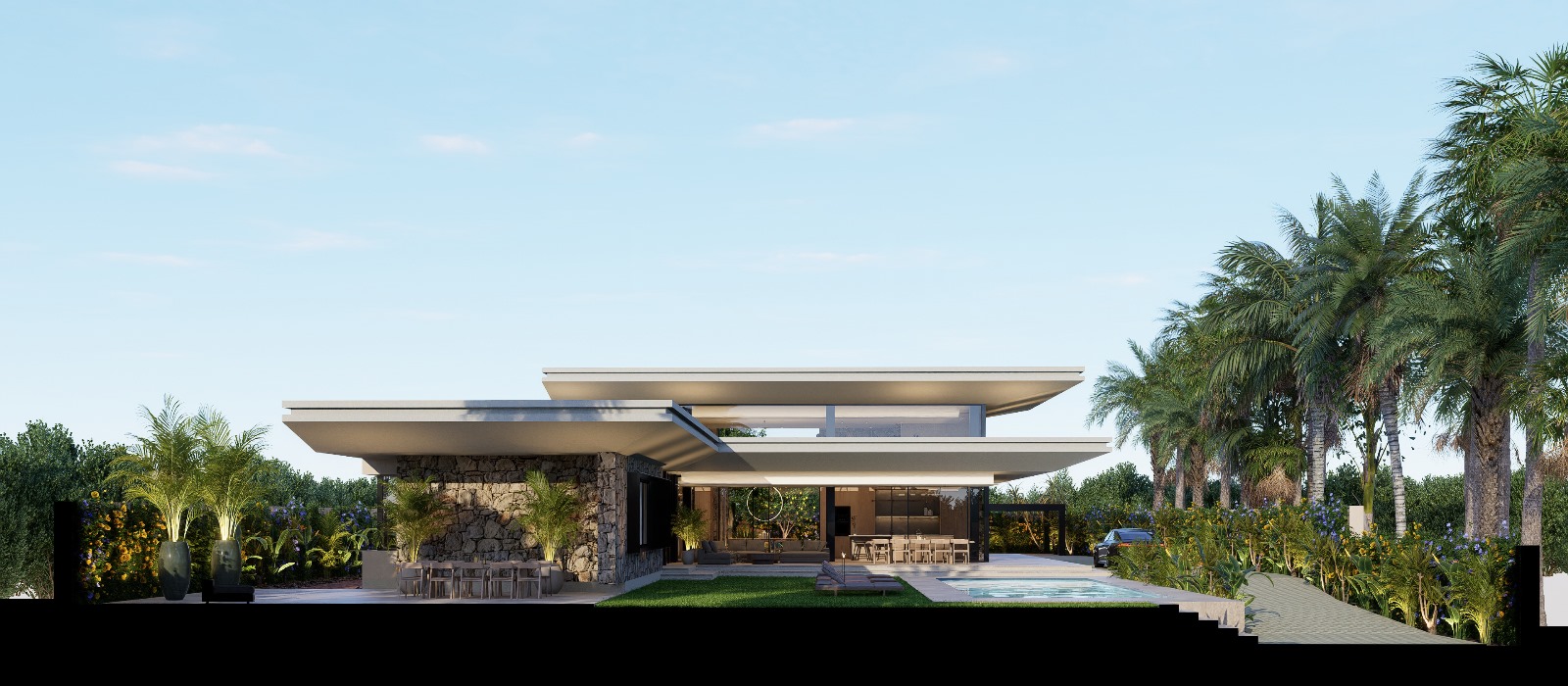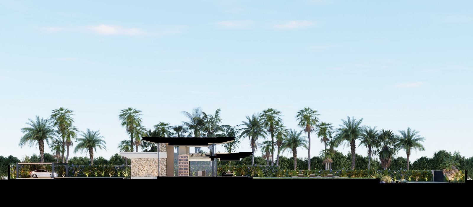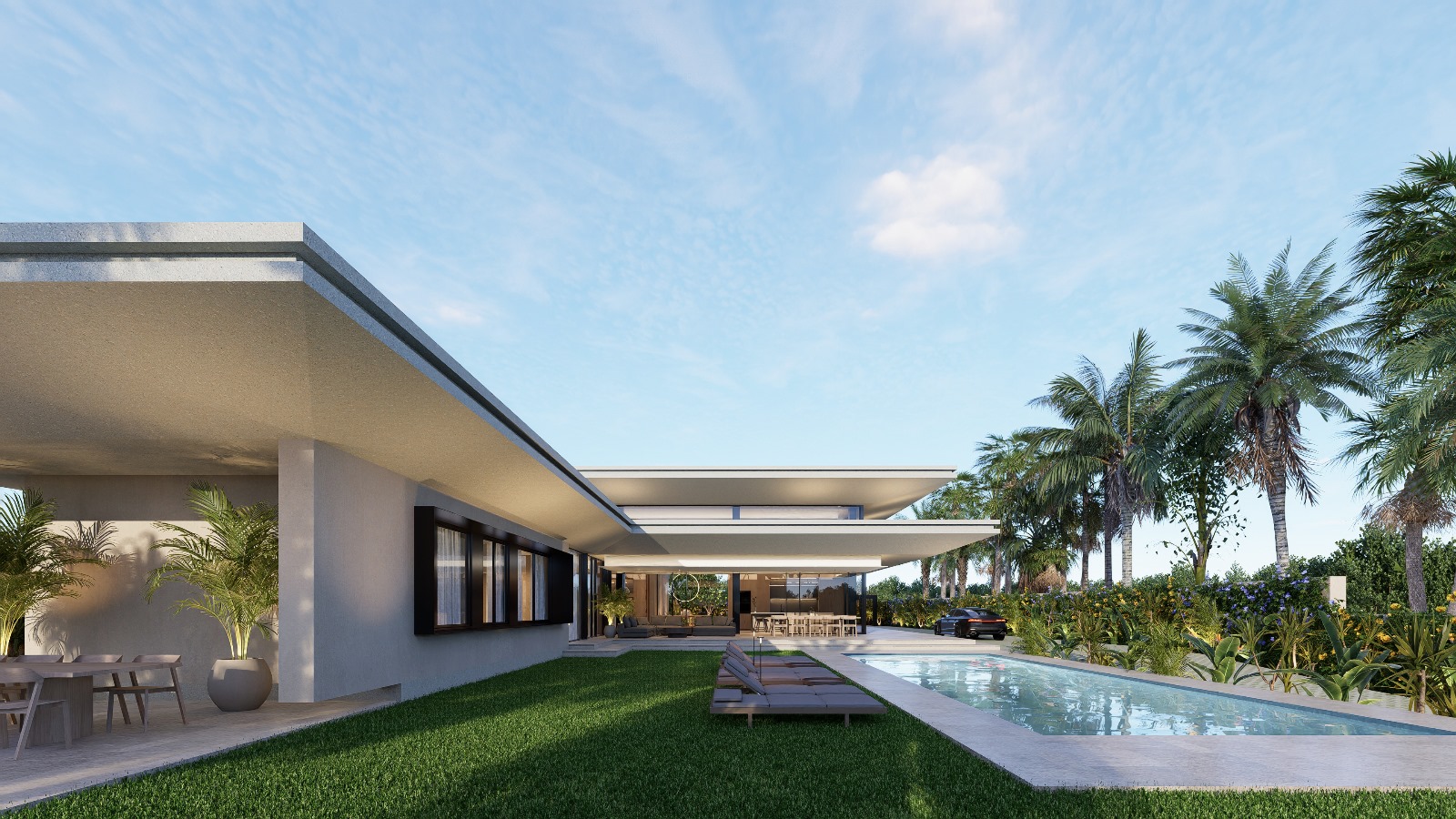 Una vivienda en una sola planta organizada en forma de L alrededor de una gran piscina y rodeada de grandes plantas y altas palmeras por todo su perímetro para mantener la privacidad y tener la sensación de estar en un jardin privado y centenario.