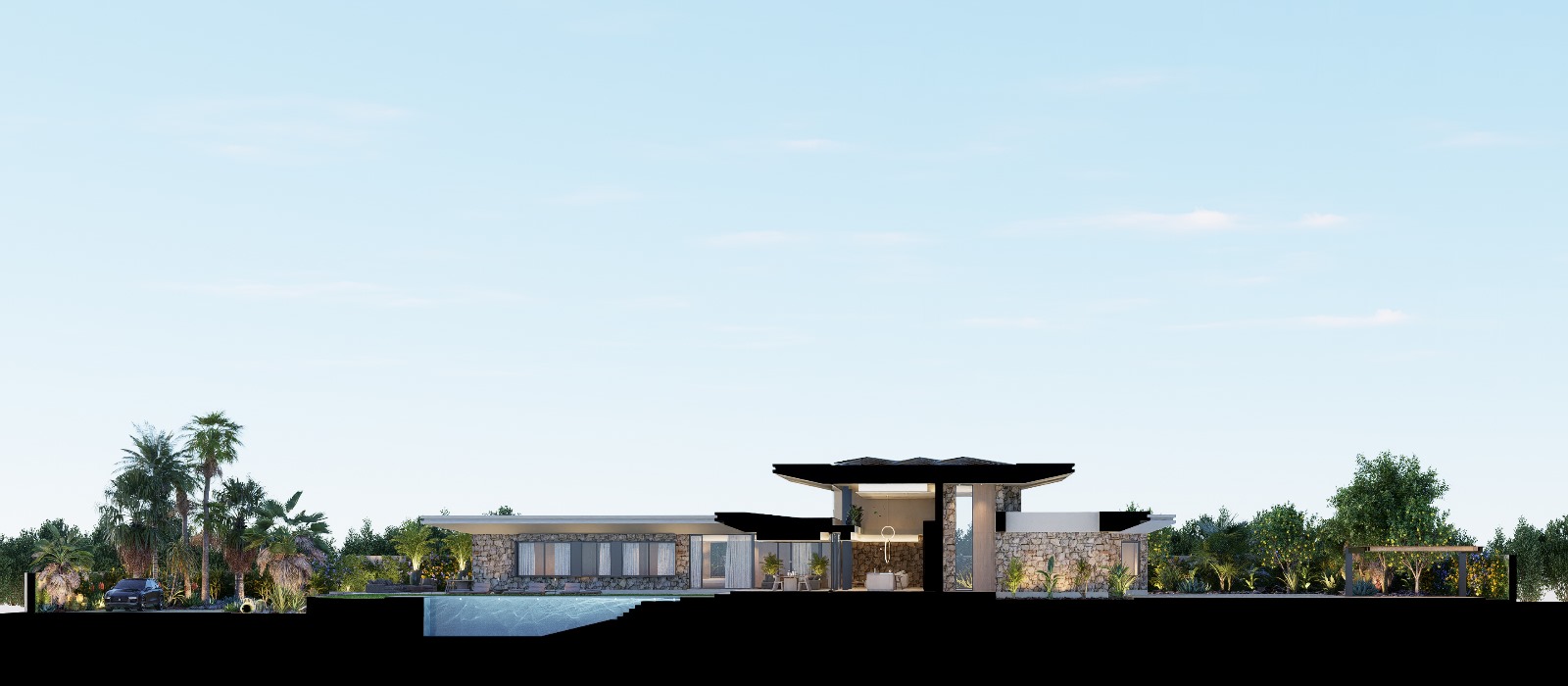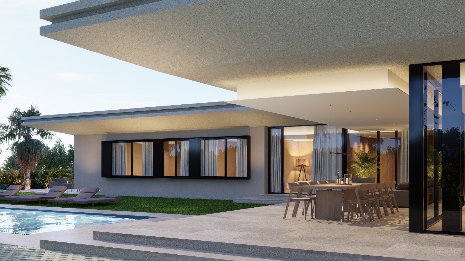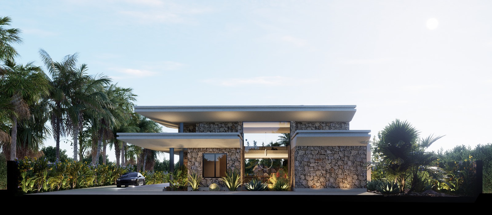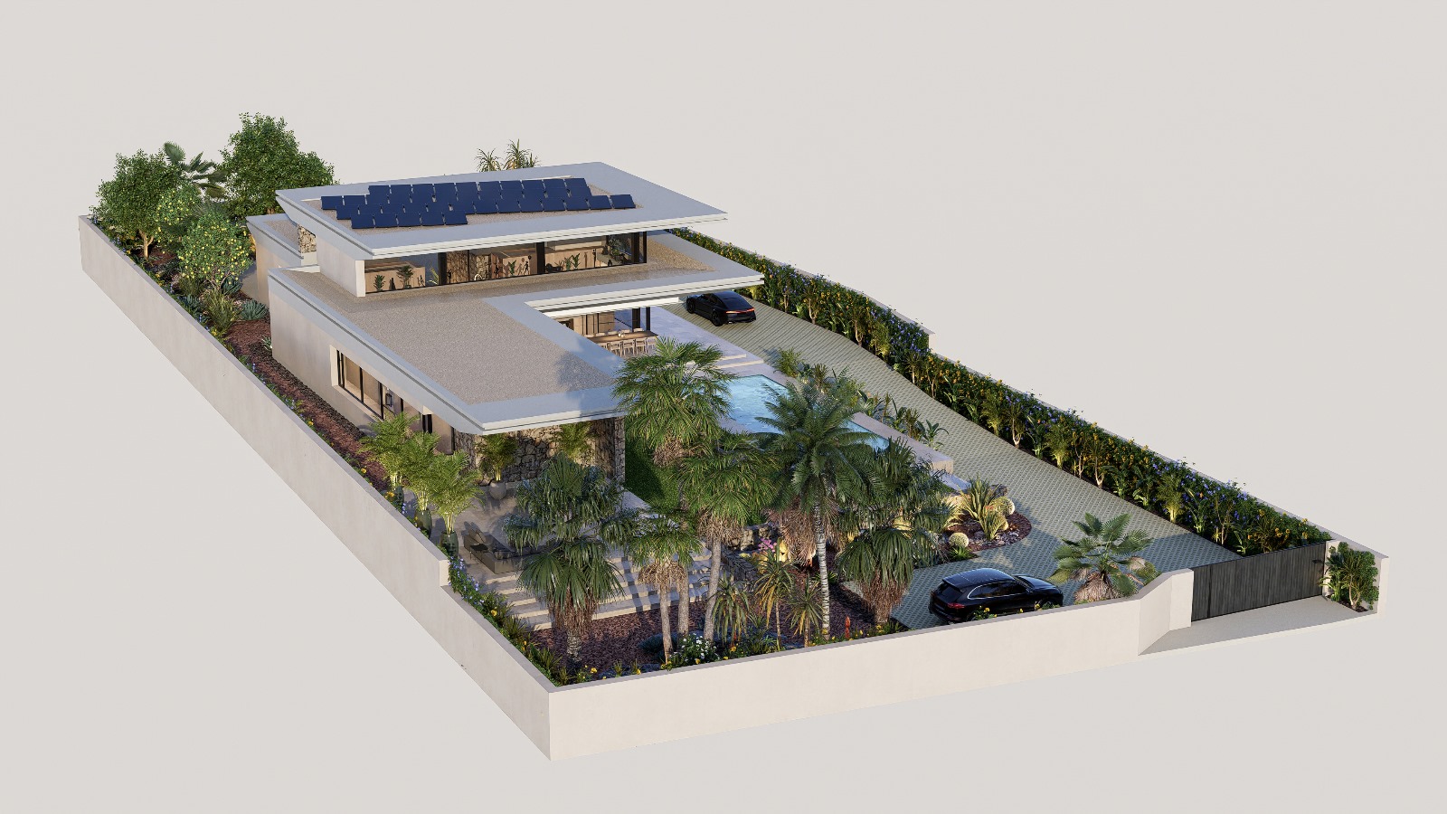 Una vivienda en una sola planta organizada en forma de L alrededor de una gran piscina y rodeada de grandes plantas y altas palmeras por todo su perímetro para mantener la privacidad y tener la sensación de estar en un jardin privado y centenario.