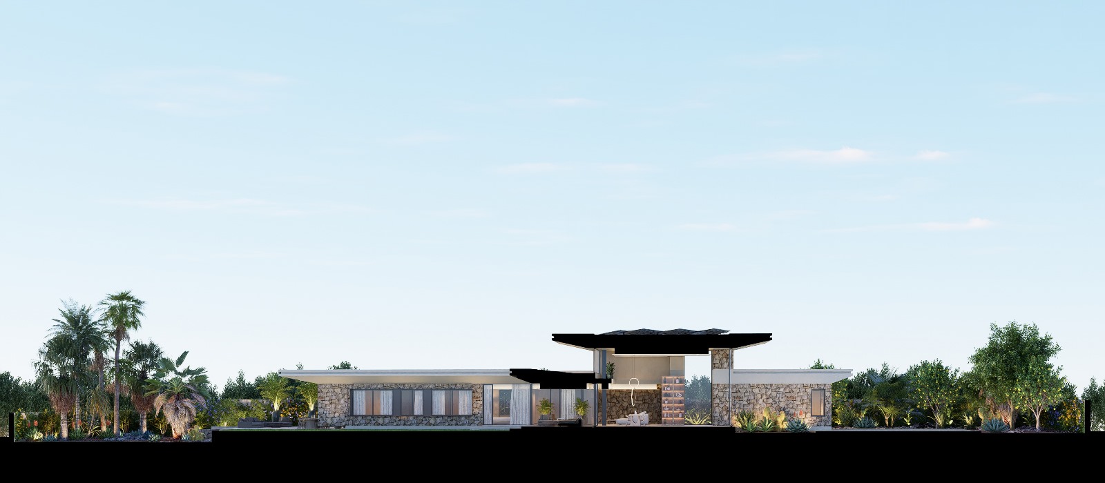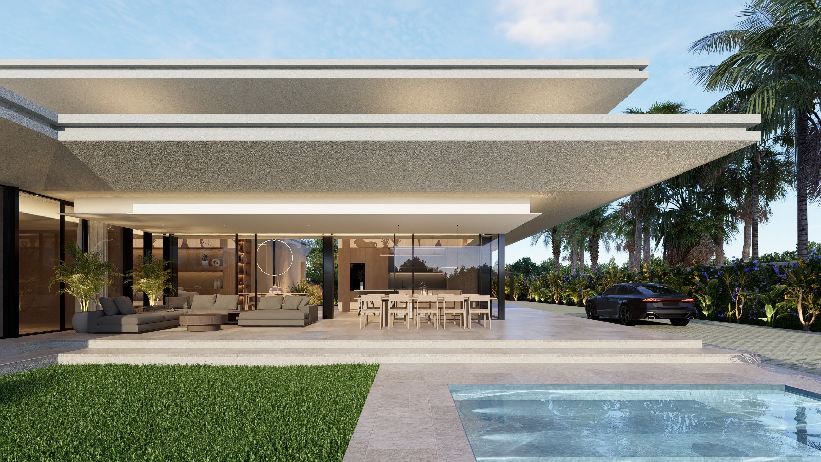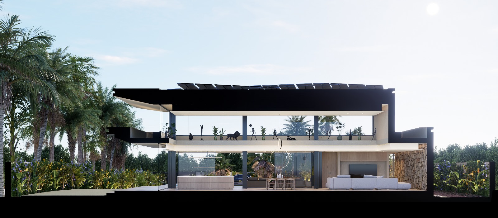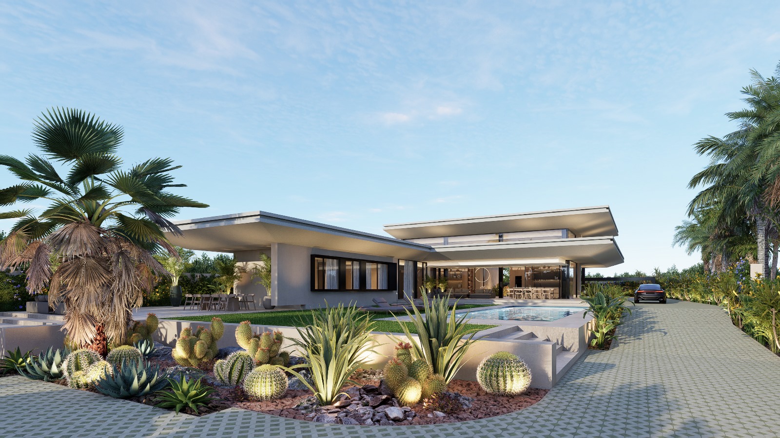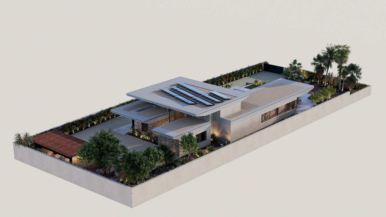 Una vivienda en una sola planta organizada en forma de L alrededor de una gran piscina y rodeada de grandes plantas y altas palmeras por todo su perímetro para mantener la privacidad y tener la sensación de estar en un jardin privado y centenario.