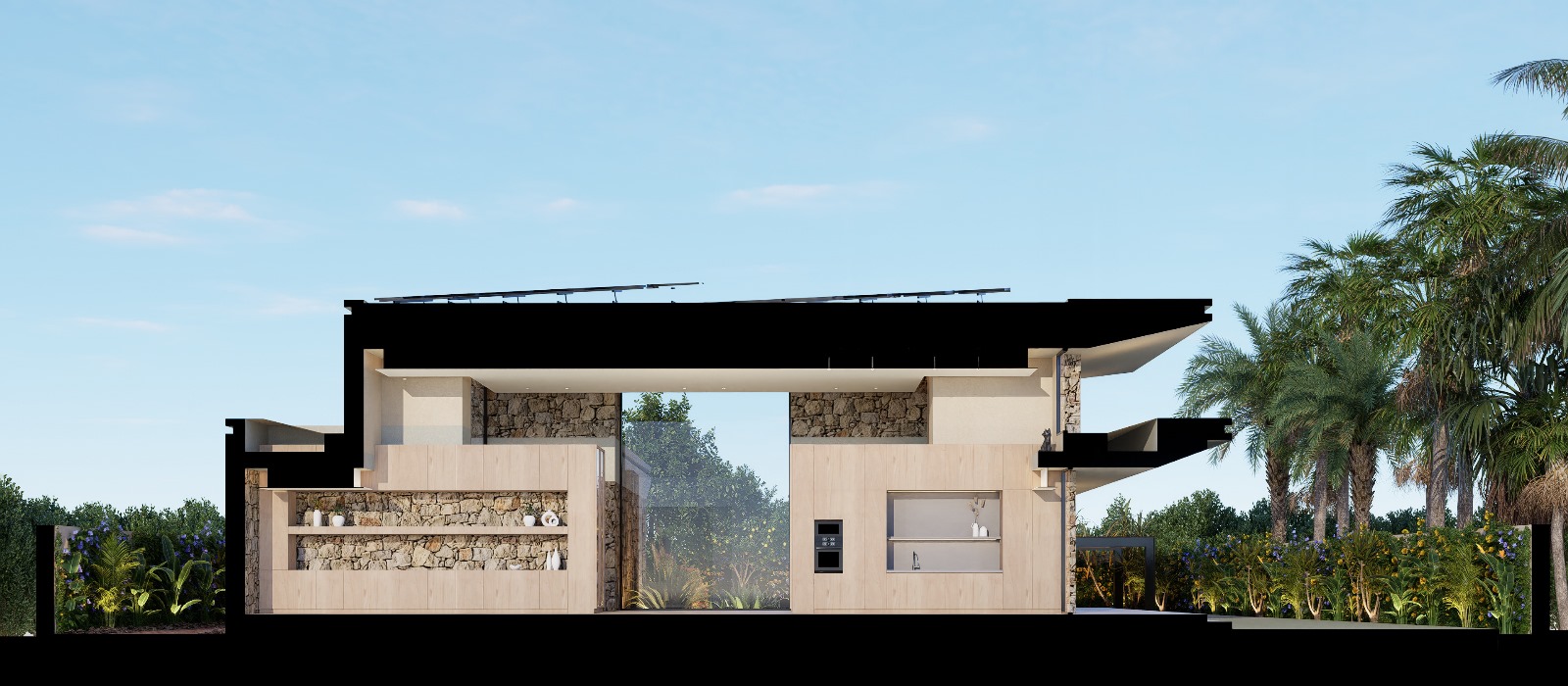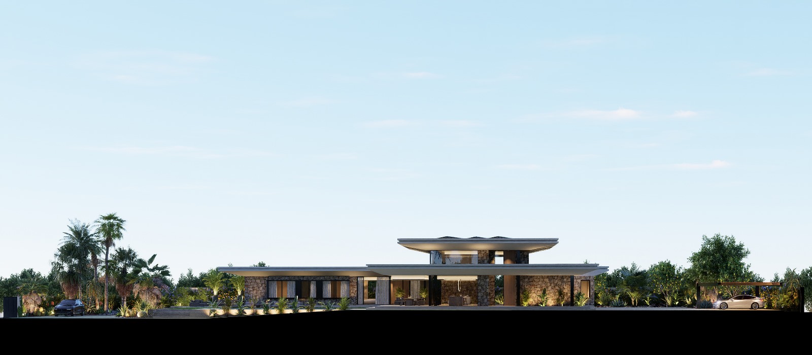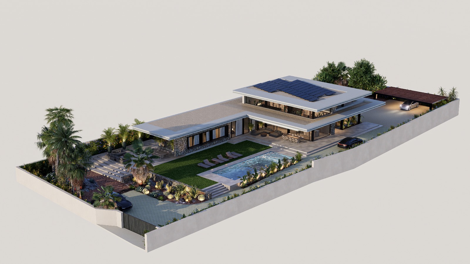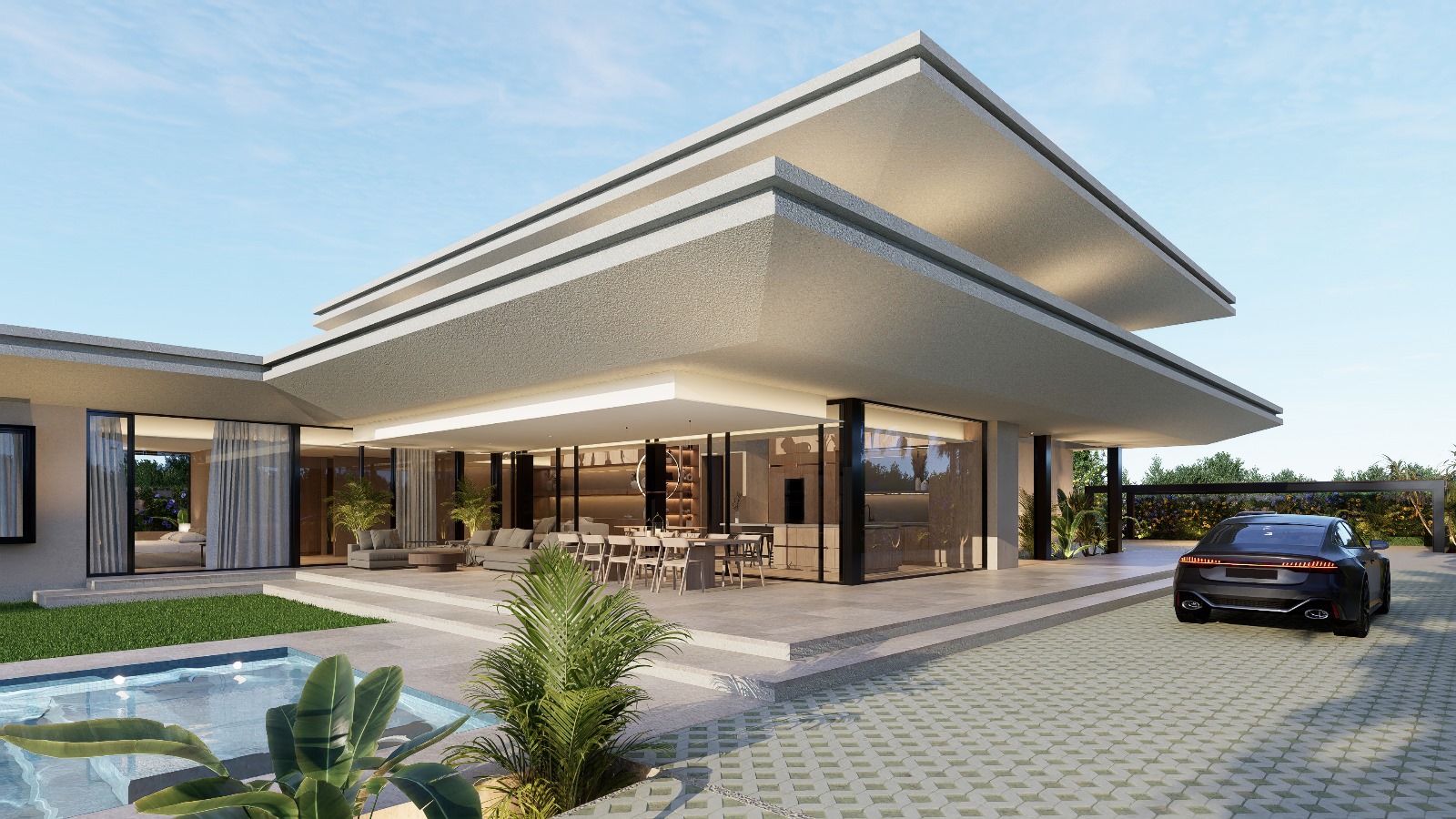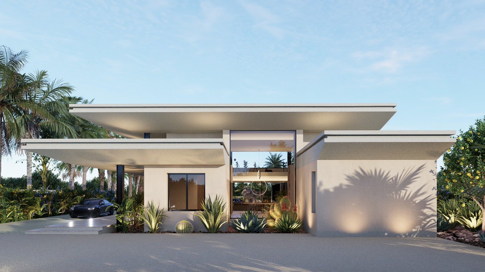 Una vivienda en una sola planta organizada en forma de L alrededor de una gran piscina y rodeada de grandes plantas y altas palmeras por todo su perímetro para mantener la privacidad y tener la sensación de estar en un jardin privado y centenario.
