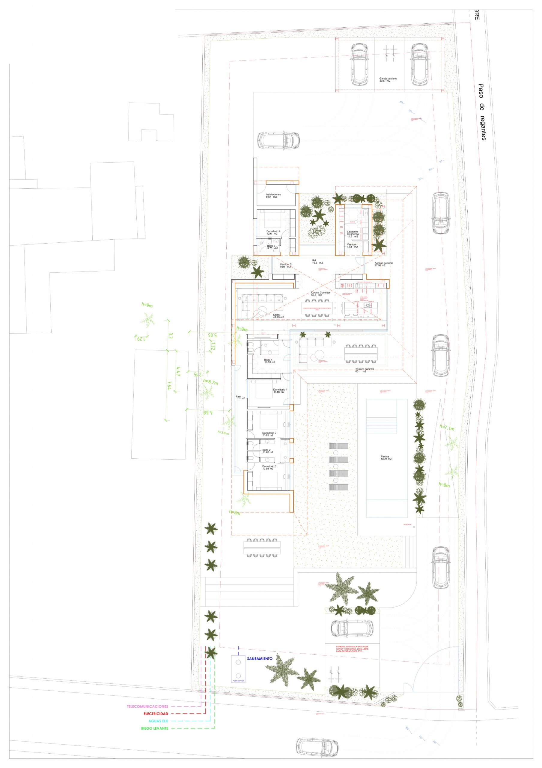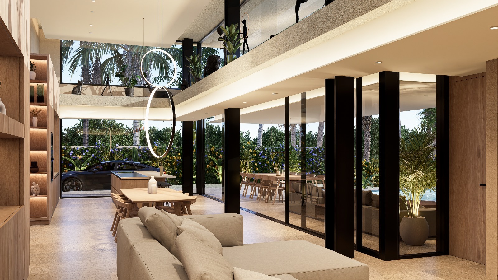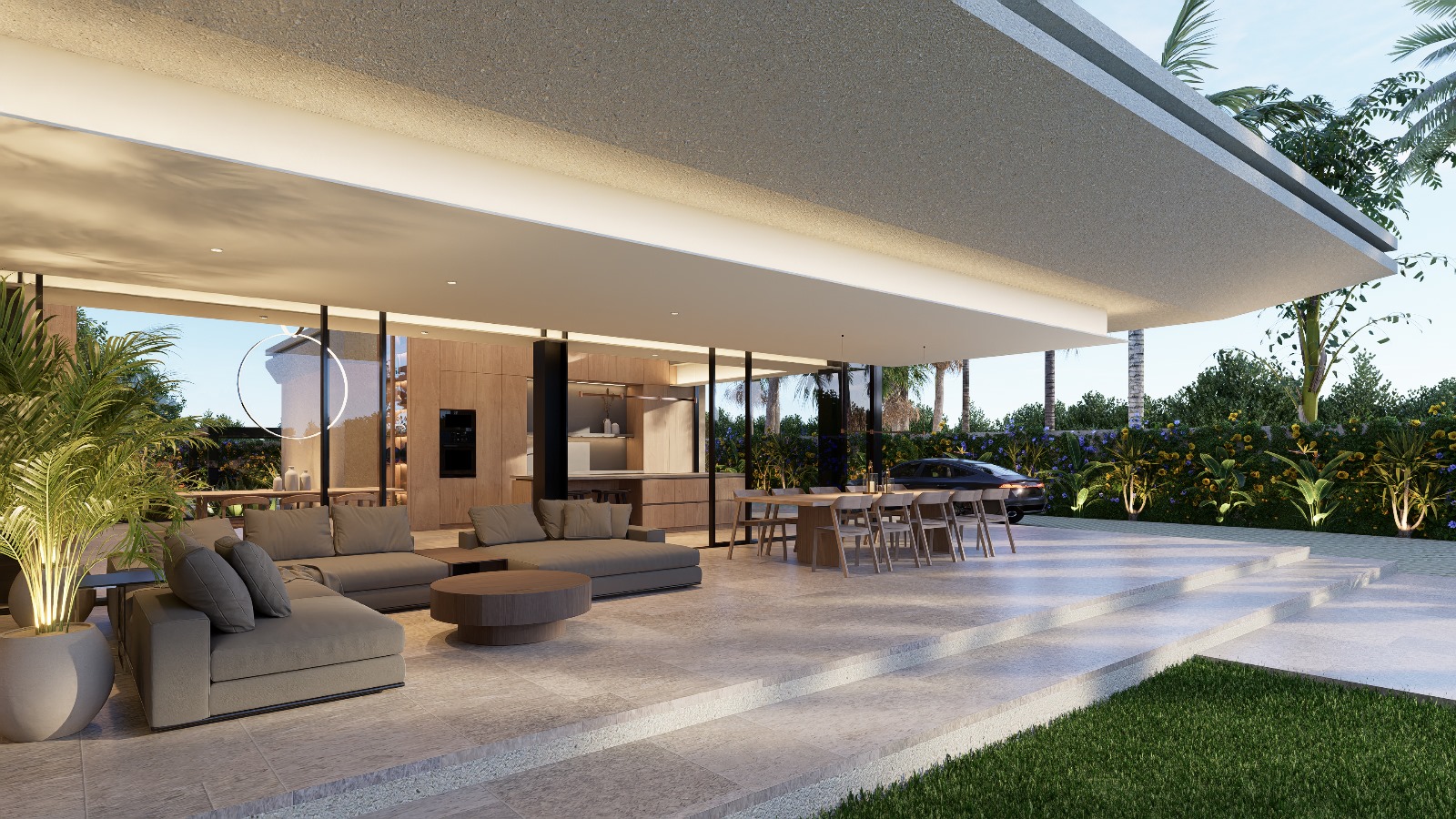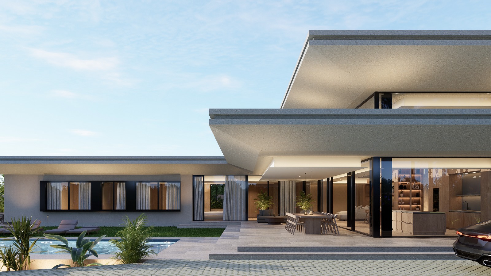 Una vivienda en una sola planta organizada en forma de L alrededor de una gran piscina y rodeada de grandes plantas y altas palmeras por todo su perímetro para mantener la privacidad y tener la sensación de estar en un jardin privado y centenario.