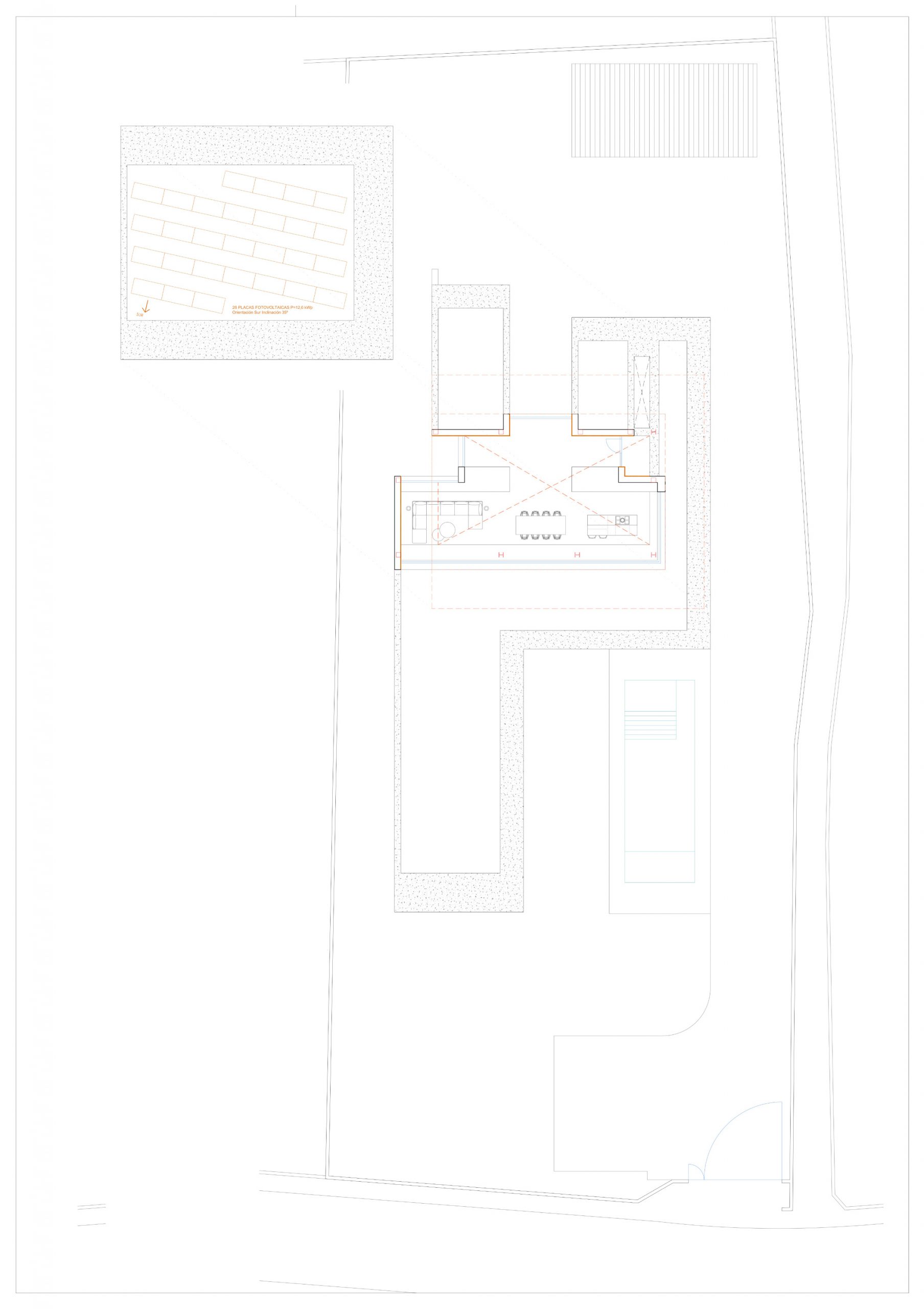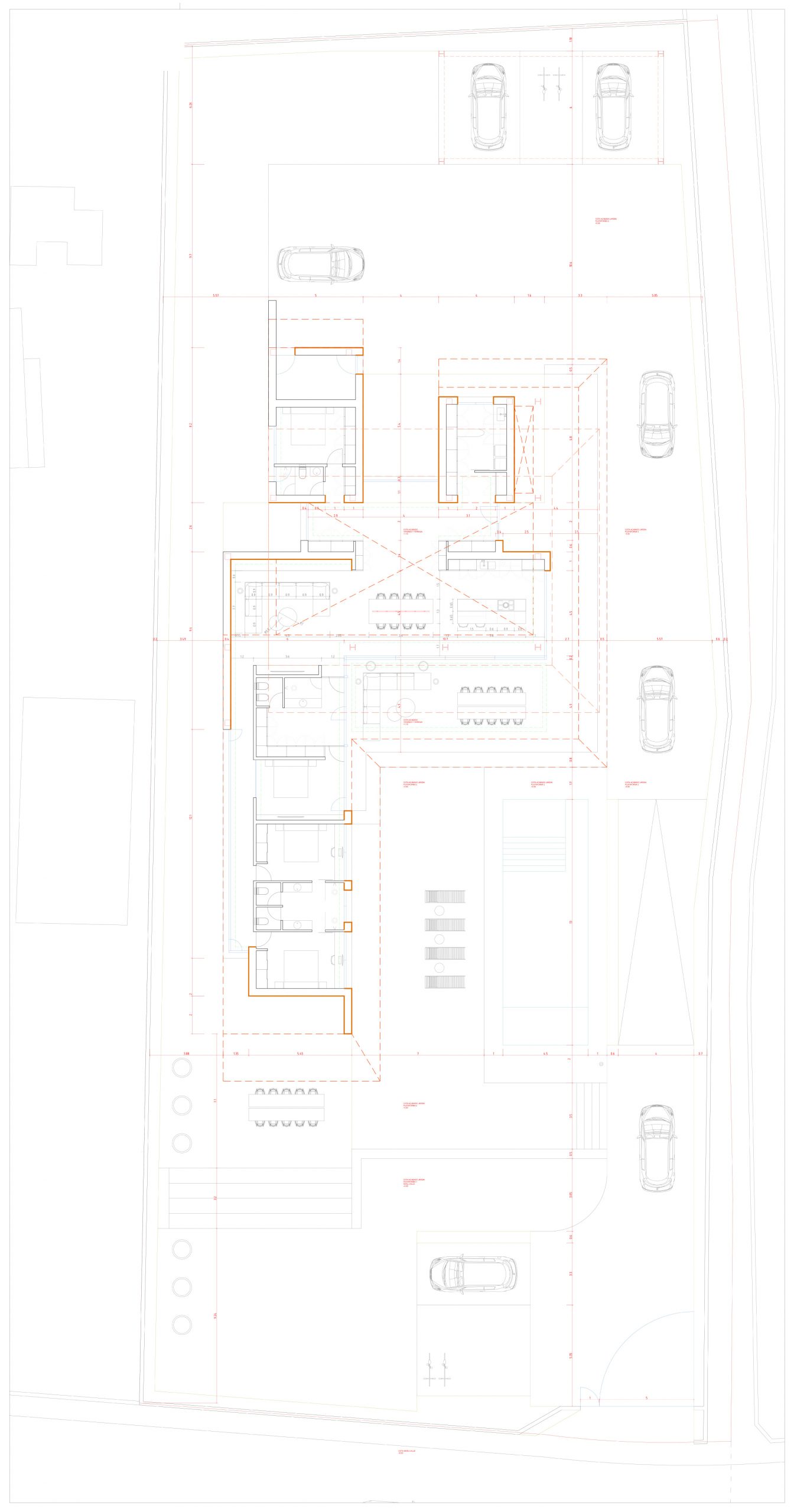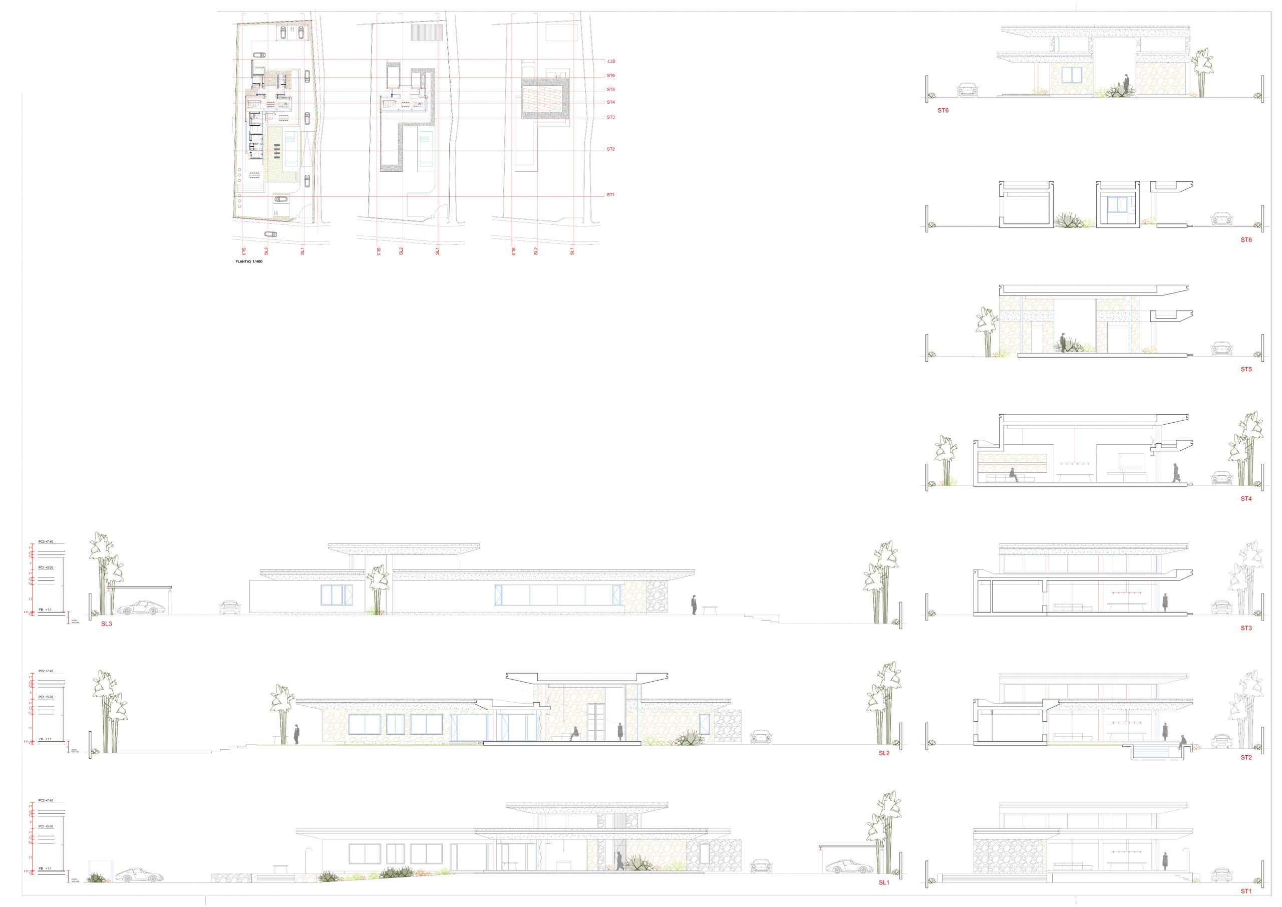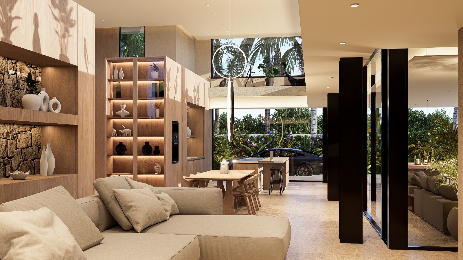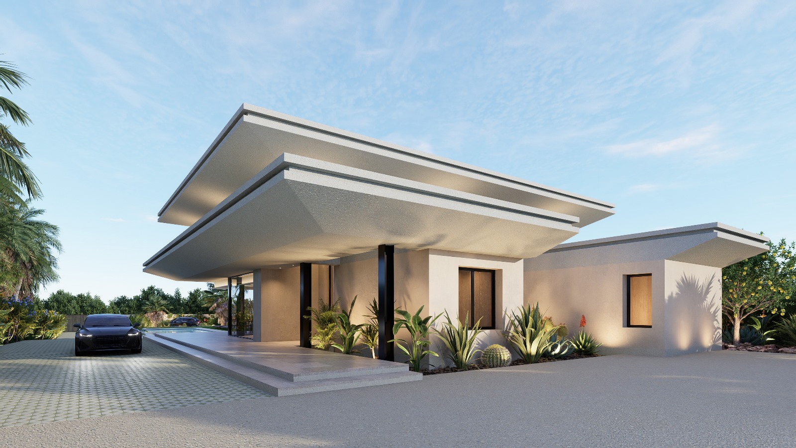 Una vivienda en una sola planta organizada en forma de L alrededor de una gran piscina y rodeada de grandes plantas y altas palmeras por todo su perímetro para mantener la privacidad y tener la sensación de estar en un jardin privado y centenario.