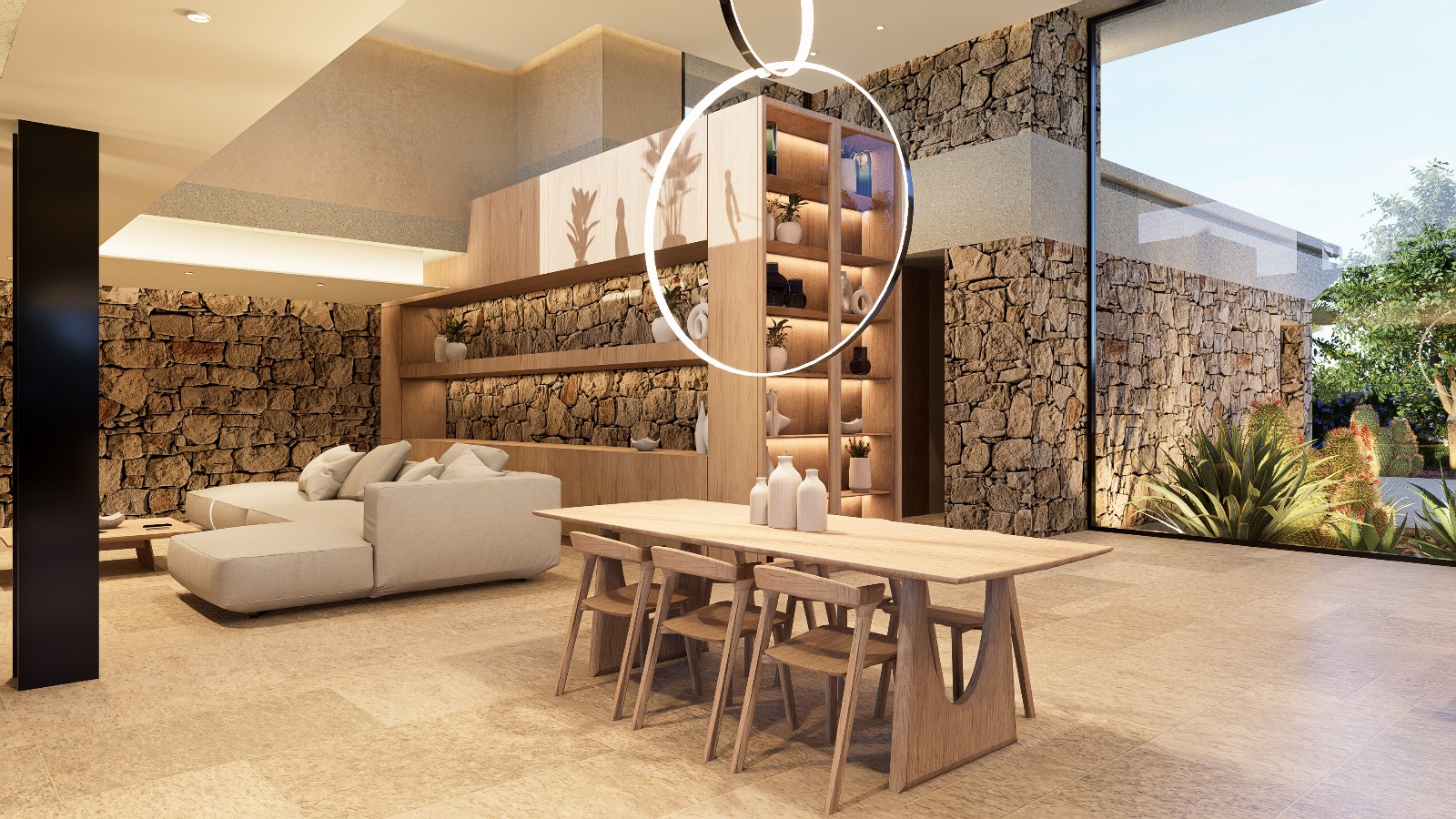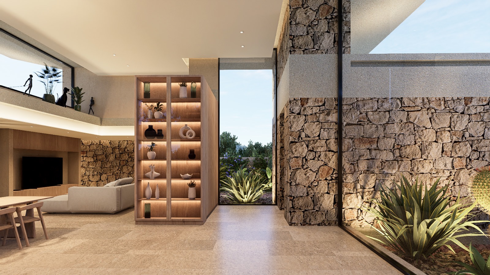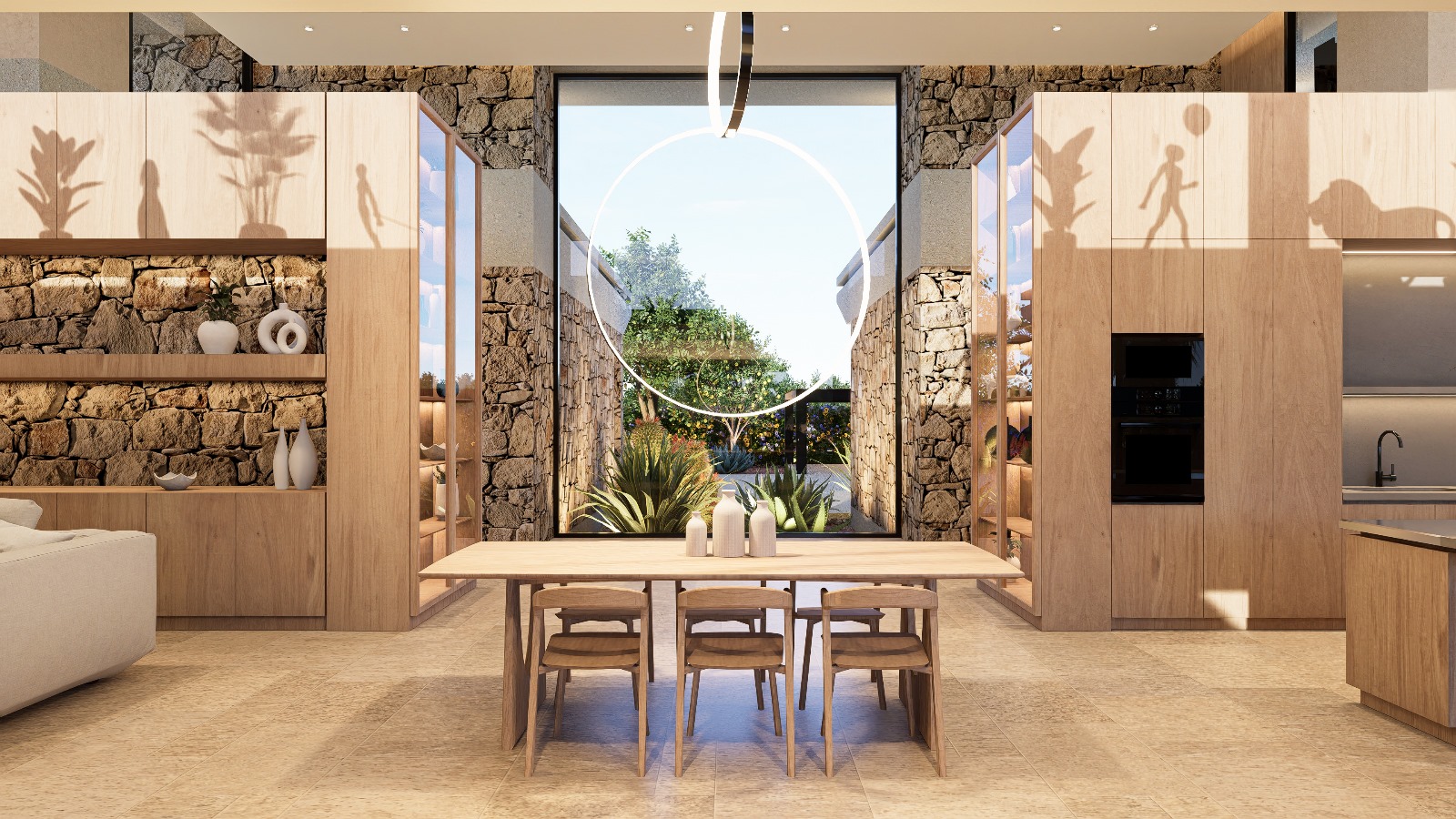 Un estilo natural y mediterráneo, de lineas y geometria contundentes, junto a la utilización y combinación de piedras, maderas y hormigón abujardado, crean unos espacios y sensaciones muy atractivas y sugerentes, y transmiten una sensación de tranquilidad en cada rincón de la casa.
