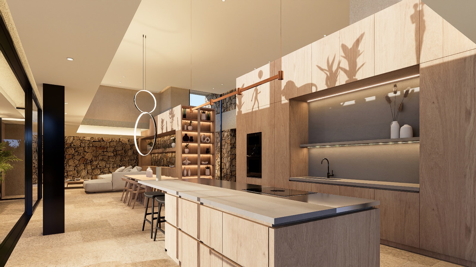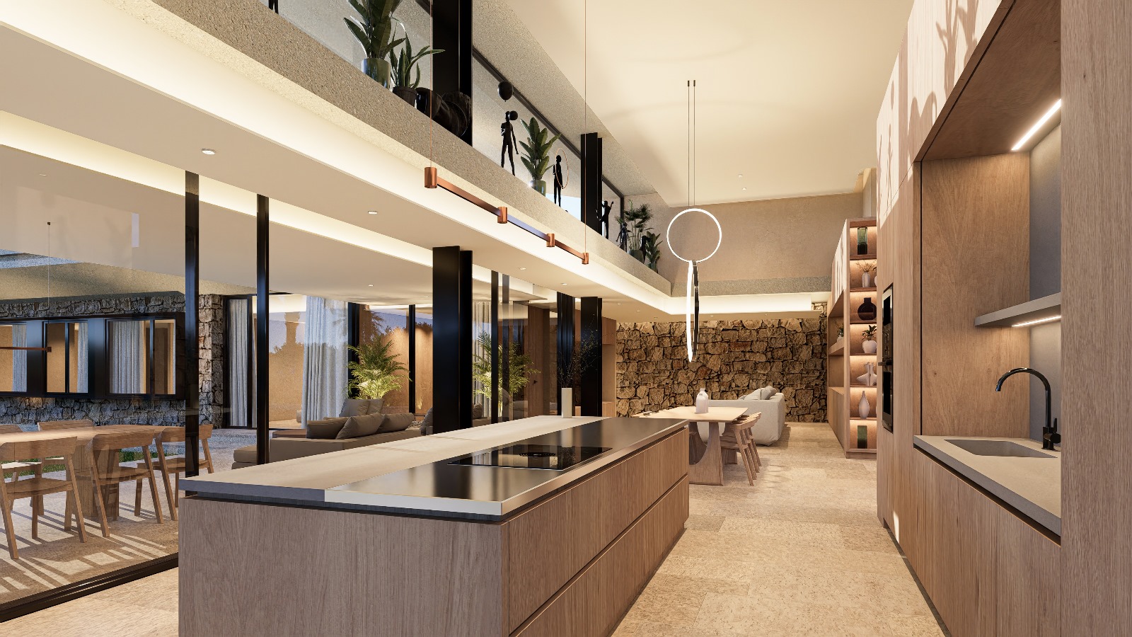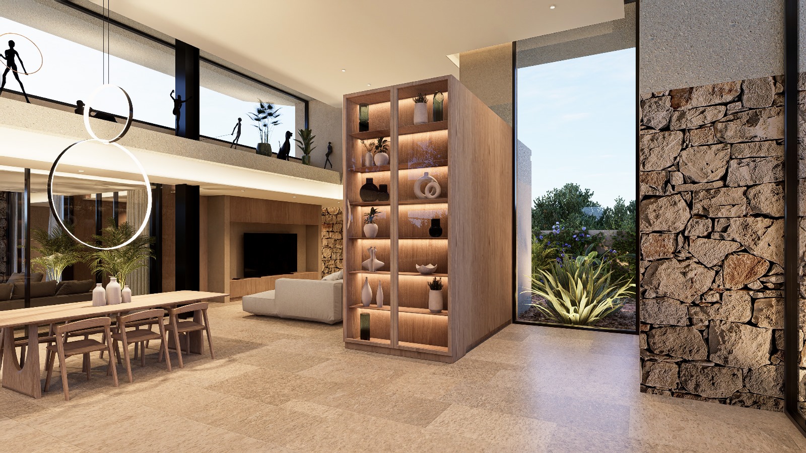 Un estilo natural y mediterráneo, de lineas y geometria contundentes, junto a la utilización y combinación de piedras, maderas y hormigón abujardado, crean unos espacios y sensaciones muy atractivas y sugerentes, y transmiten una sensación de tranquilidad en cada rincón de la casa.