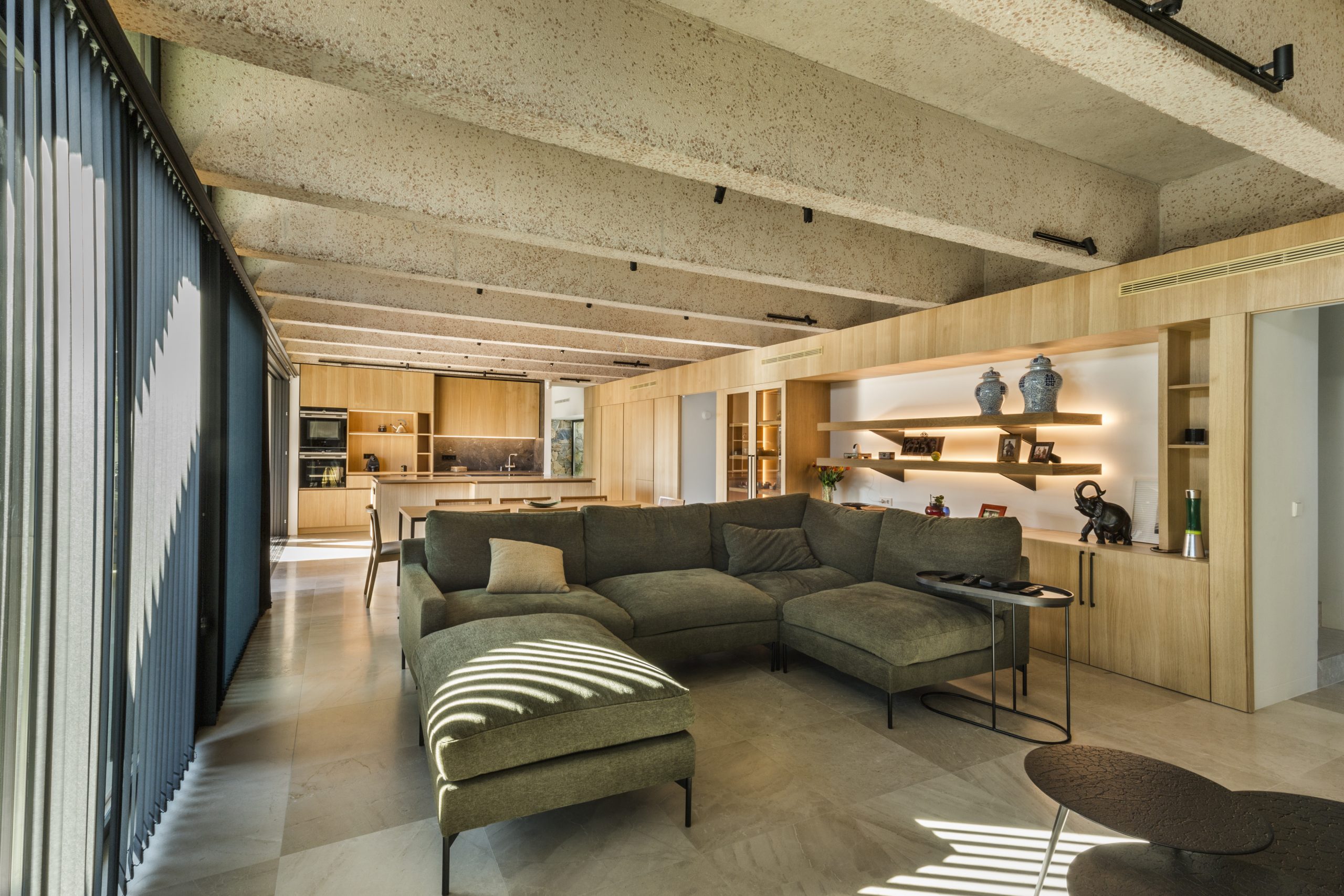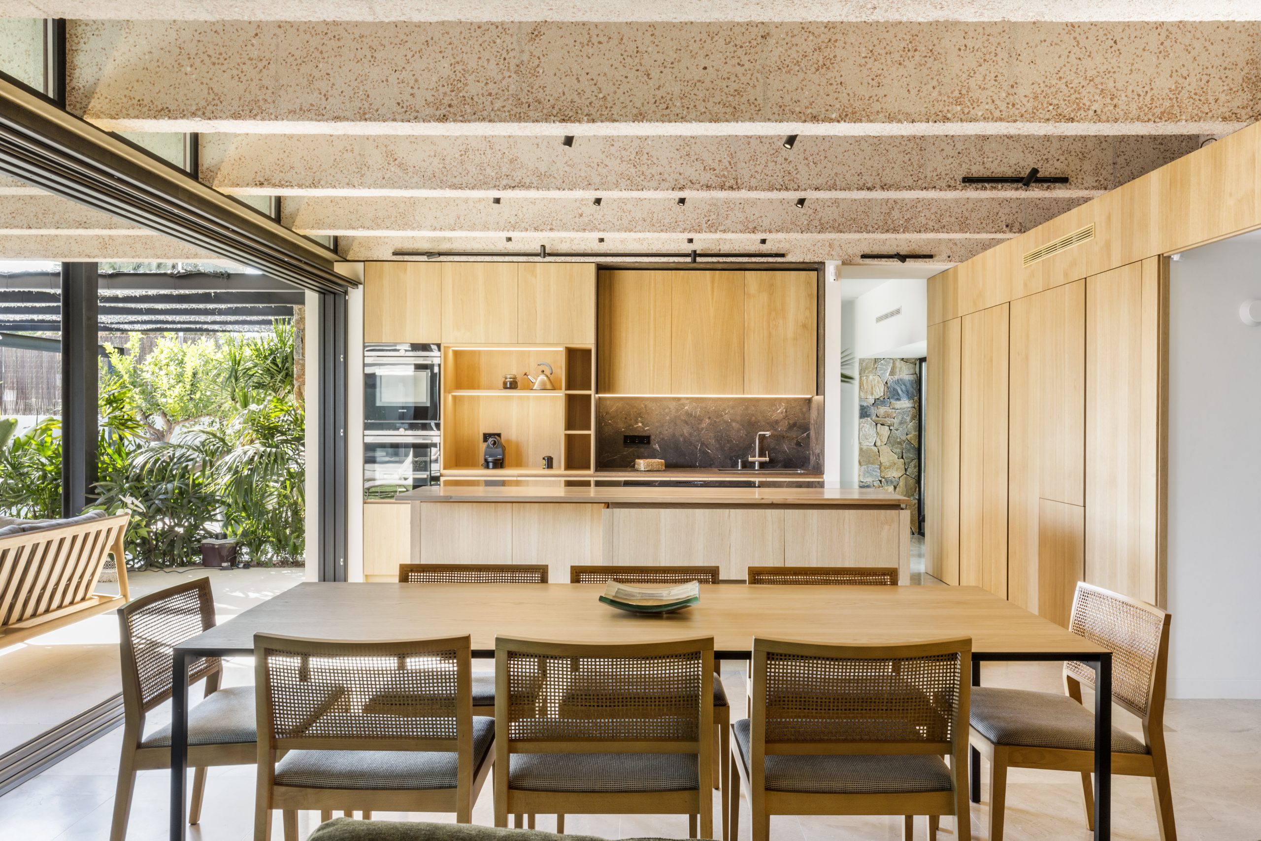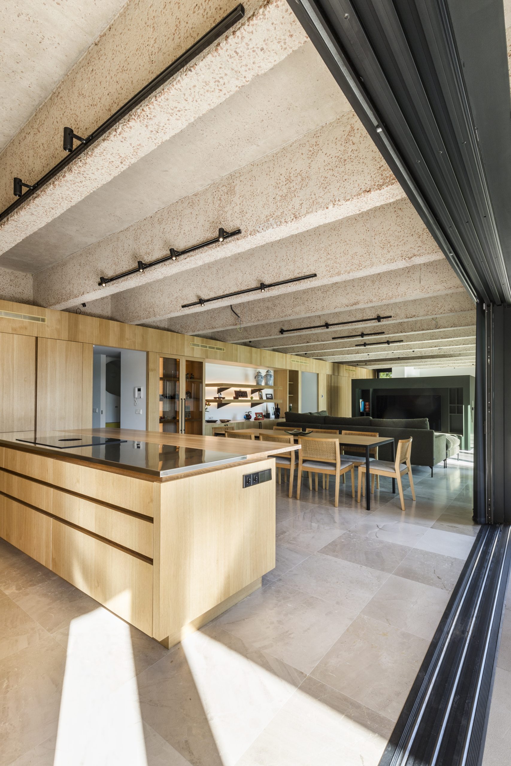 Todo el mobiliario interior se diseña a medida, sin llegar hasta el techo para no cortar la continuidad visual de las vigas de hormigón, y dejar que cocina, comedor, salón y despacho quedan formando parte de un mismo espacio.