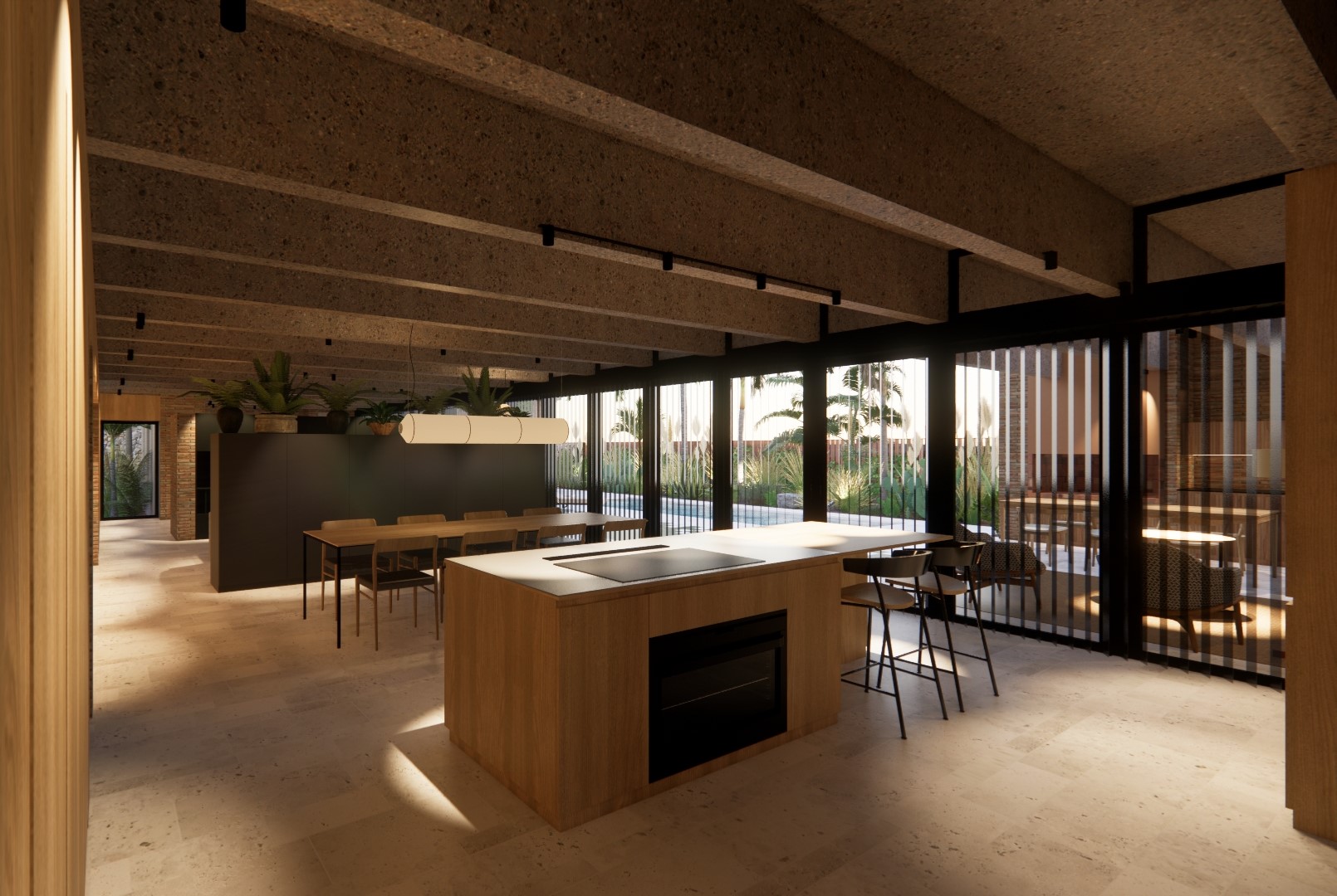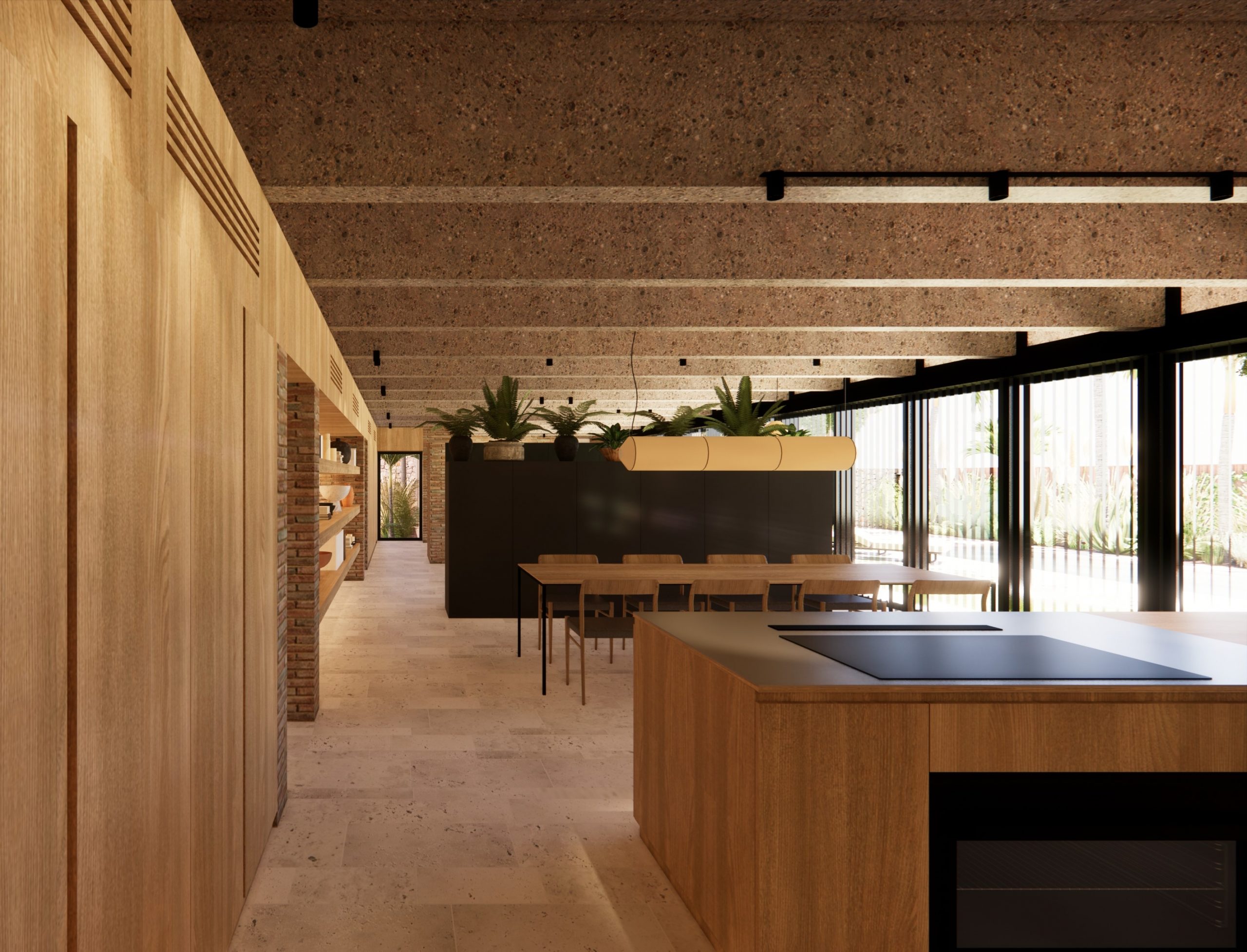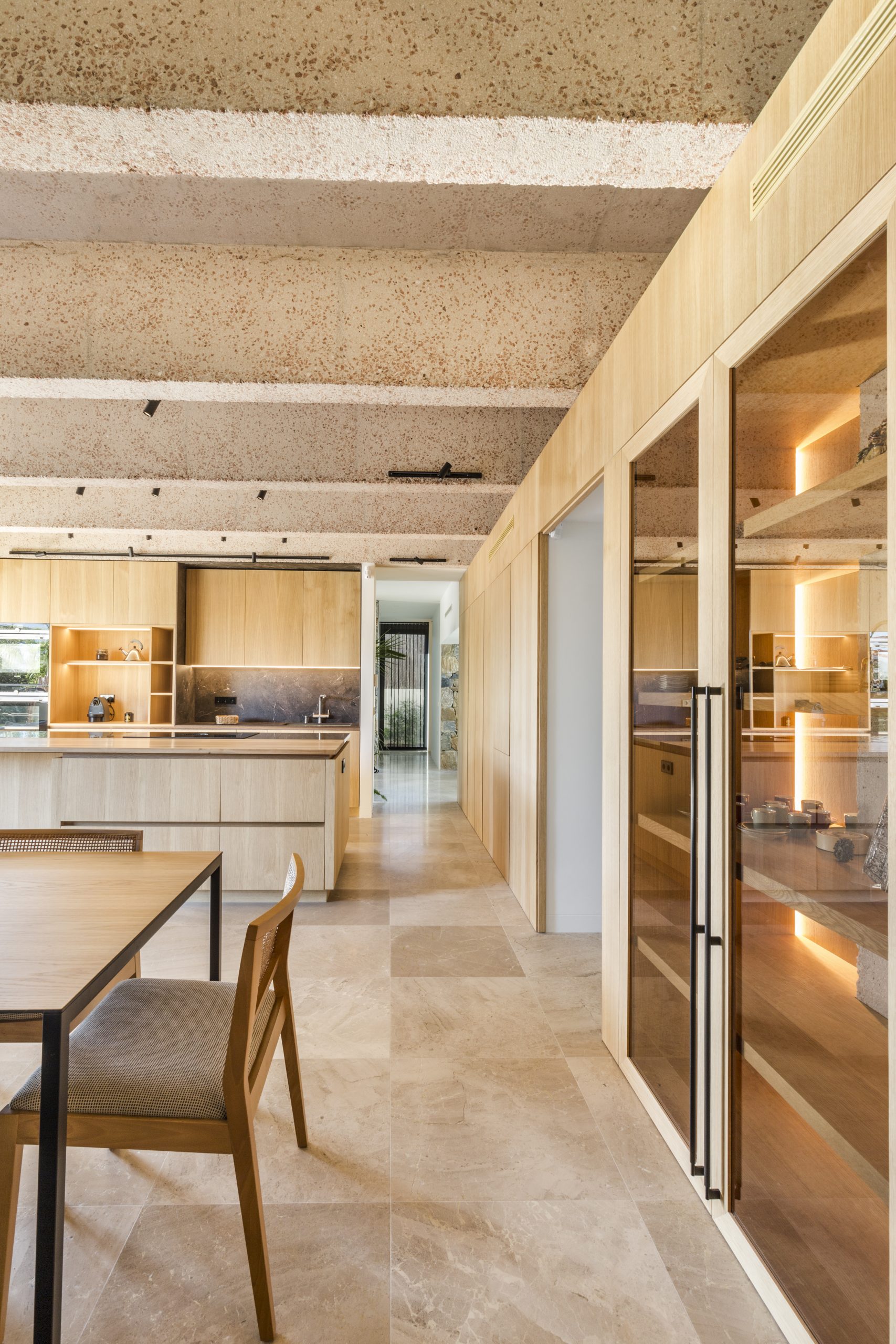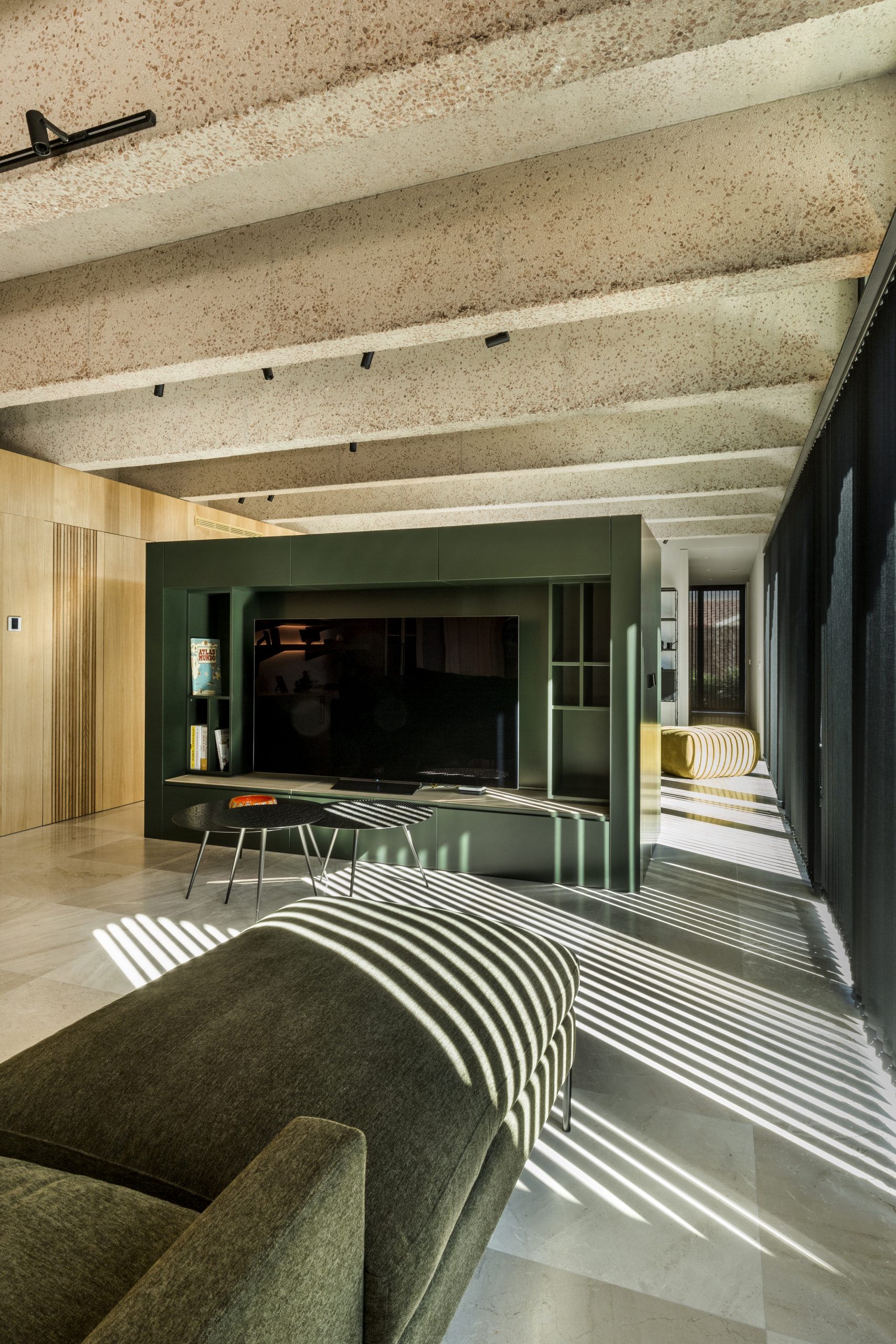 Todo el mobiliario interior se diseña a medida, sin llegar hasta el techo para no cortar la continuidad visual de las vigas de hormigón, y dejar que cocina, comedor, salón y despacho quedan formando parte de un mismo espacio.