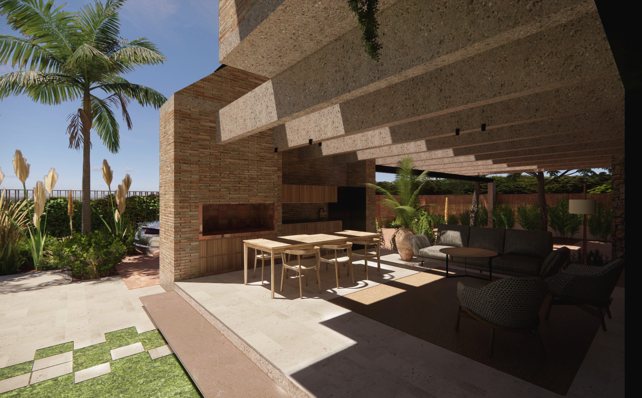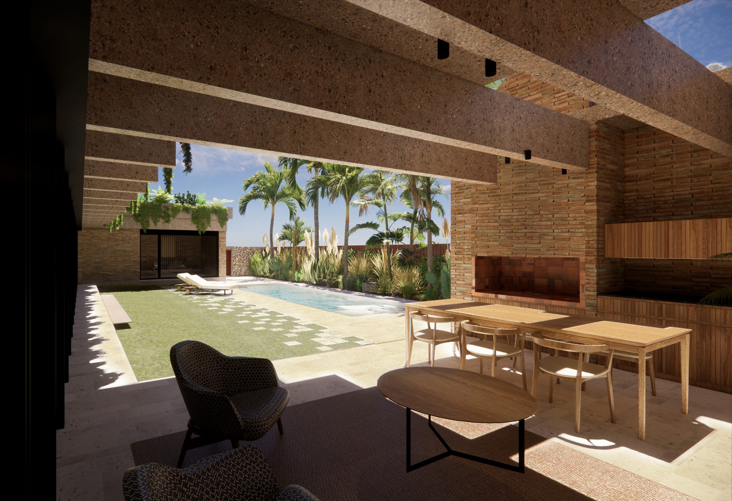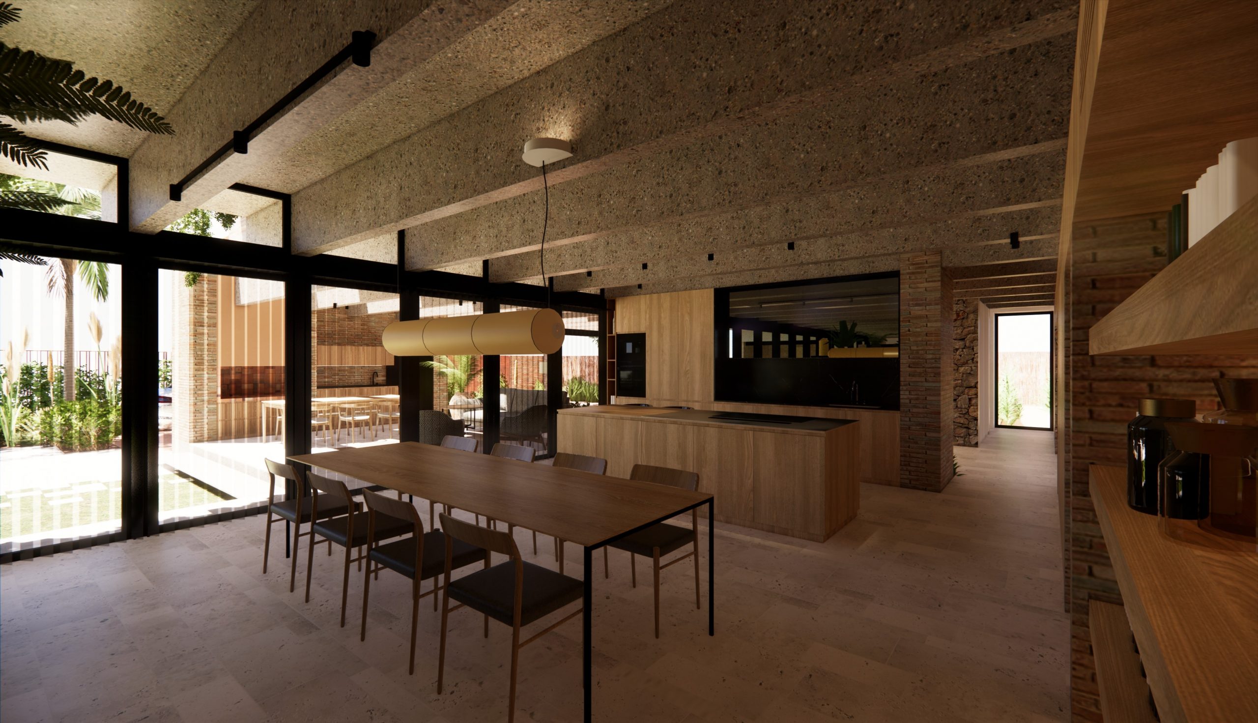 Como en el proyecto de Higueras, en nuestra casa se busca la máxima honestidad de la estructura y de los materiales quedando vista en toda la planta baja de la vivienda la estructura de losas y vigas de hormigón armado, con un acabado abujardado que genera una ambiente cálido y brutalista al mismo tiempo.