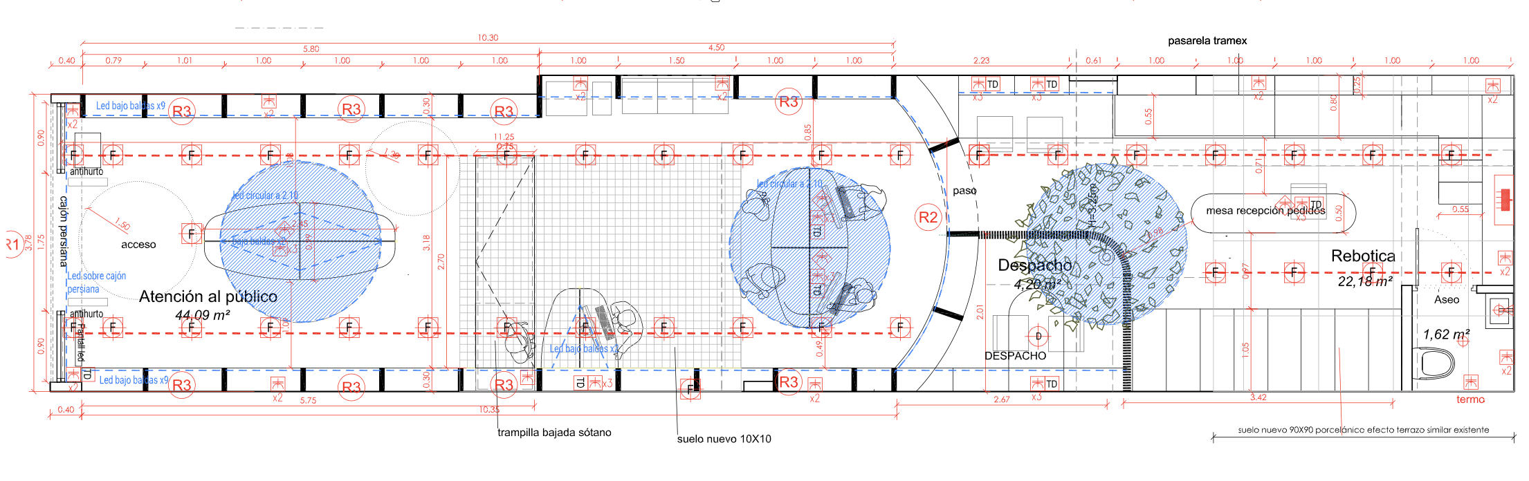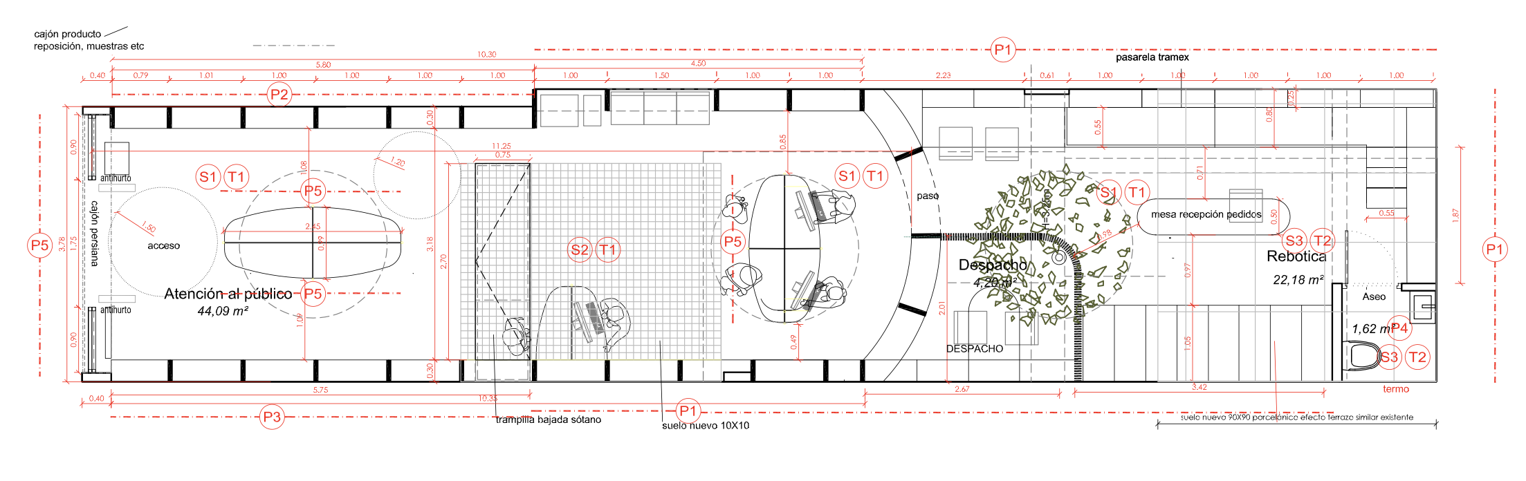 Para ello, se diseña todo el mobiliario específicamente para el proyecto y se deja una zona central de exposición y demostraciones que permite que el cliente se sienta cómodo y pueda examinar los productos con tranquilidad.