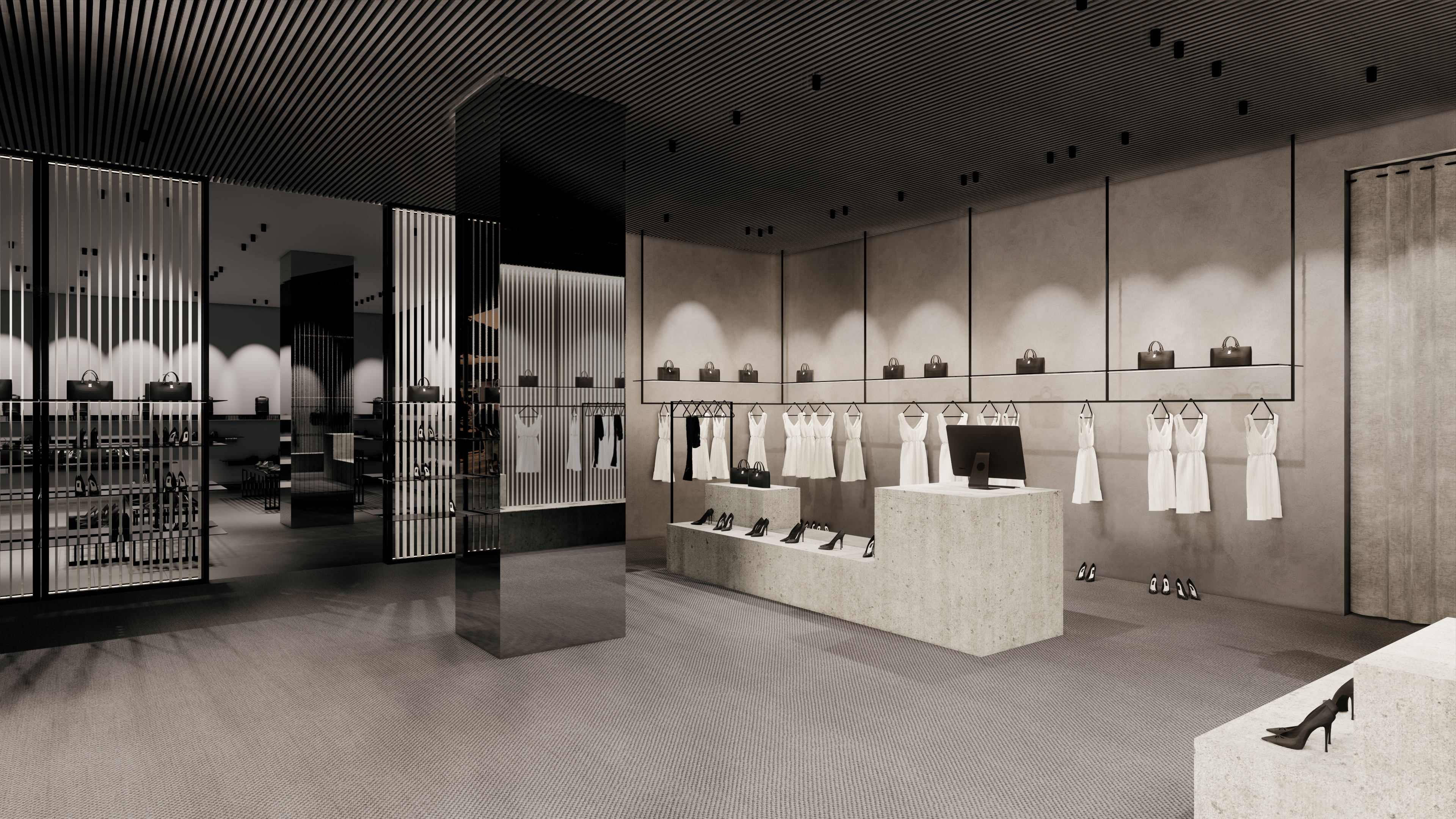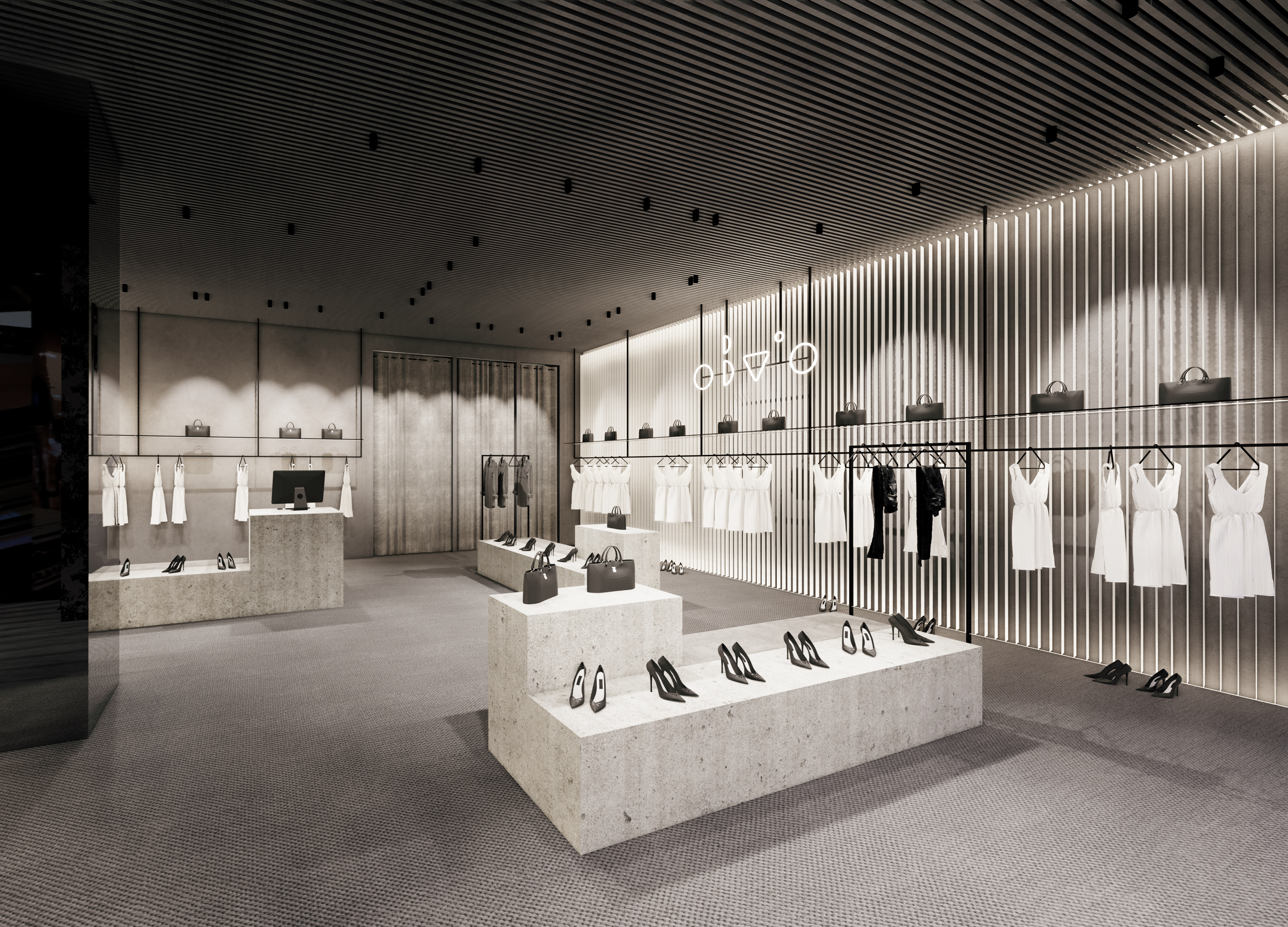 Materiales básicos, acero, piedra y pavimento continuo con trama textil, con una estudiada iluminación y unas piezas de mobiliario diseñado, con formas geométricas muy potentes, al servicio del producto expuesto, fue la estrategia del proyecto para que la ropa OBVIO consiguiera su objetivo.