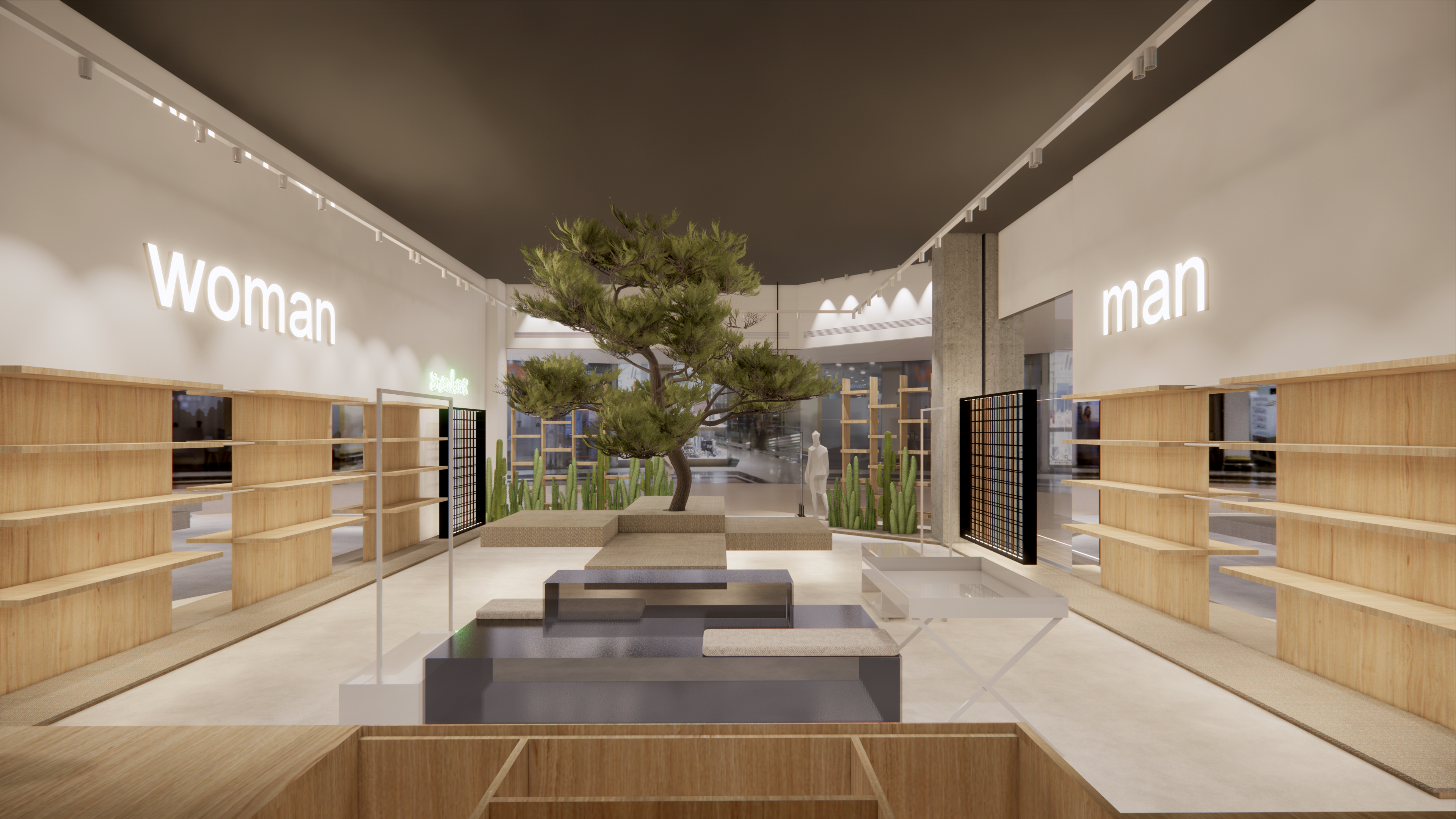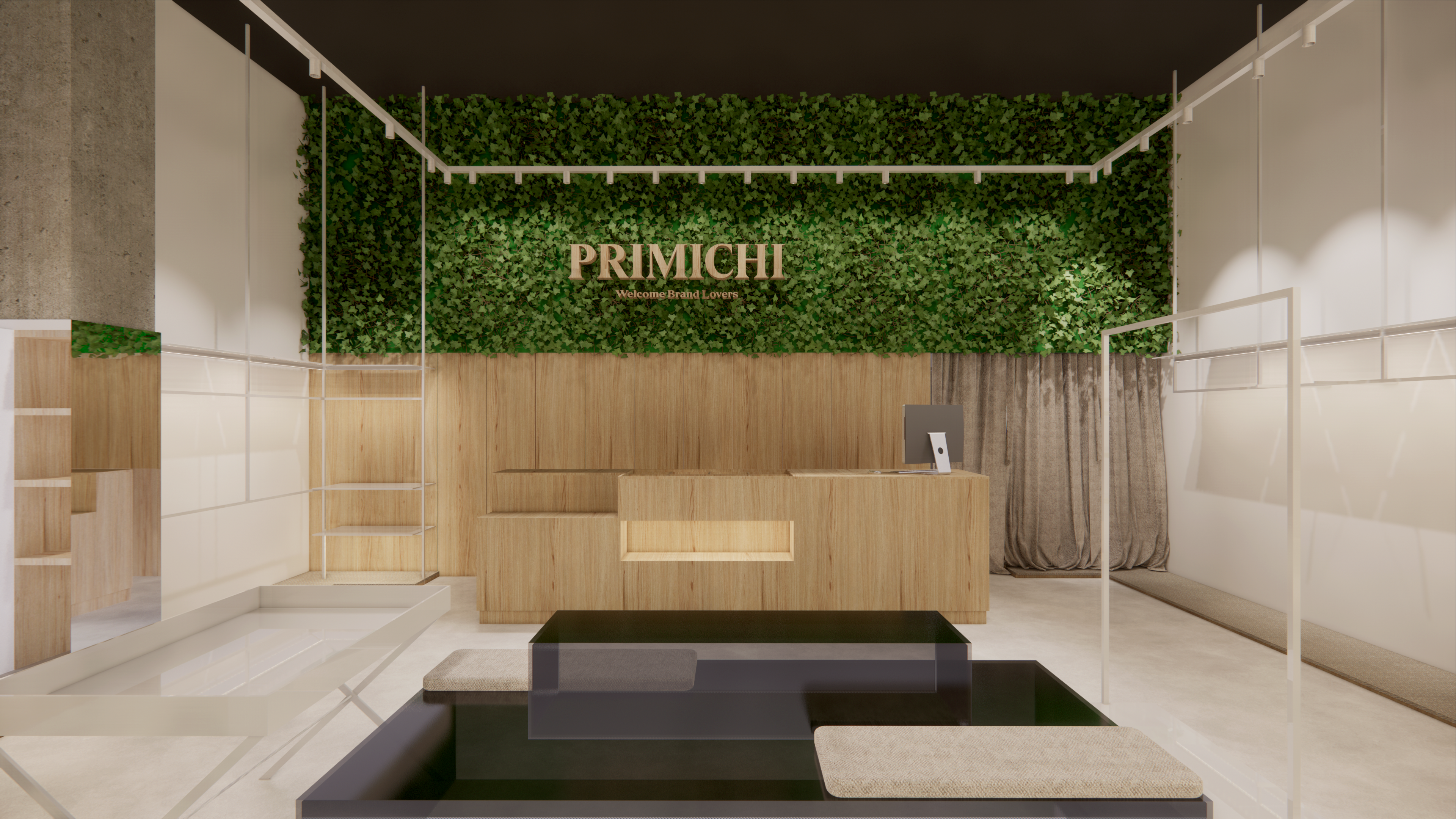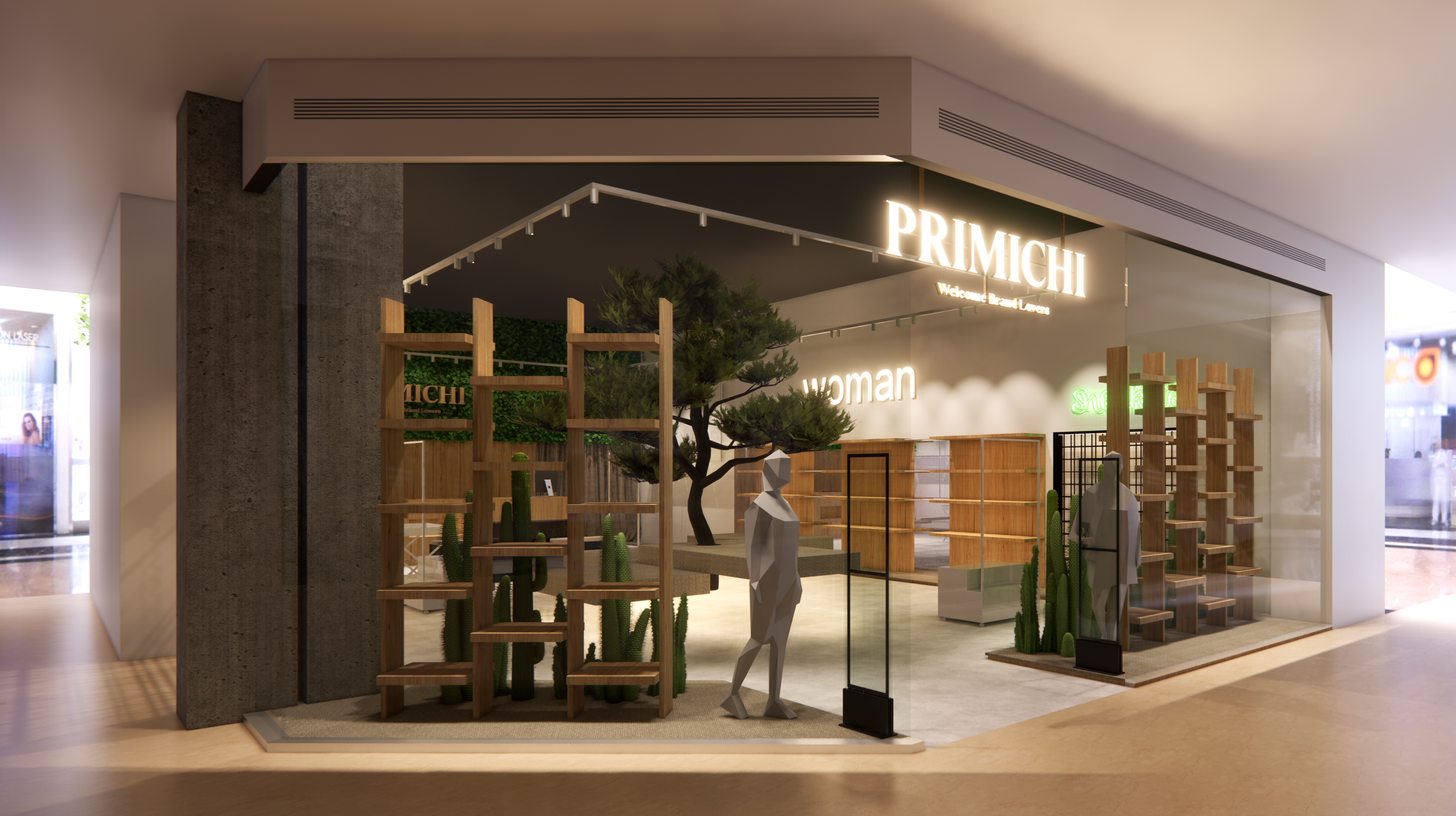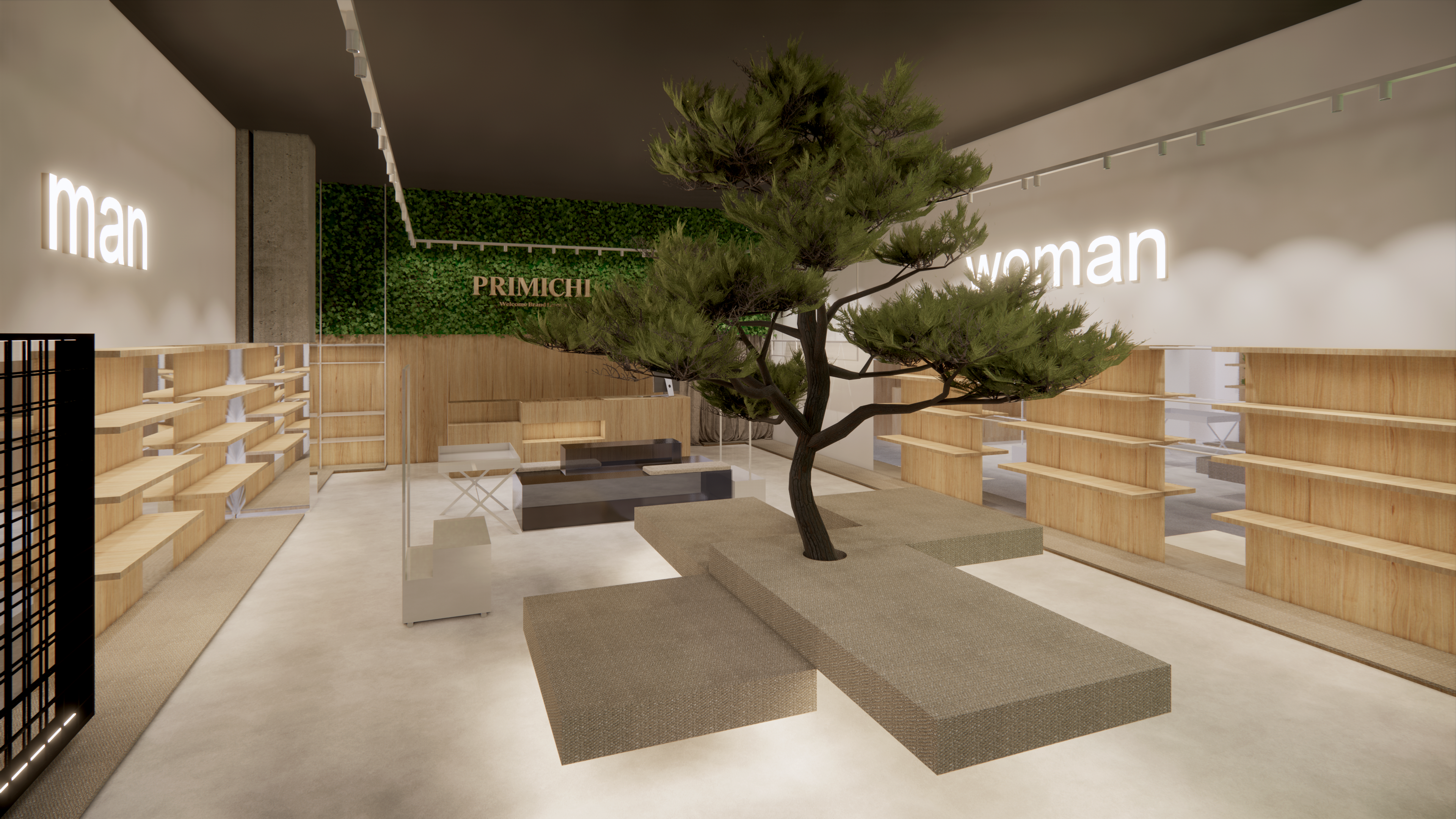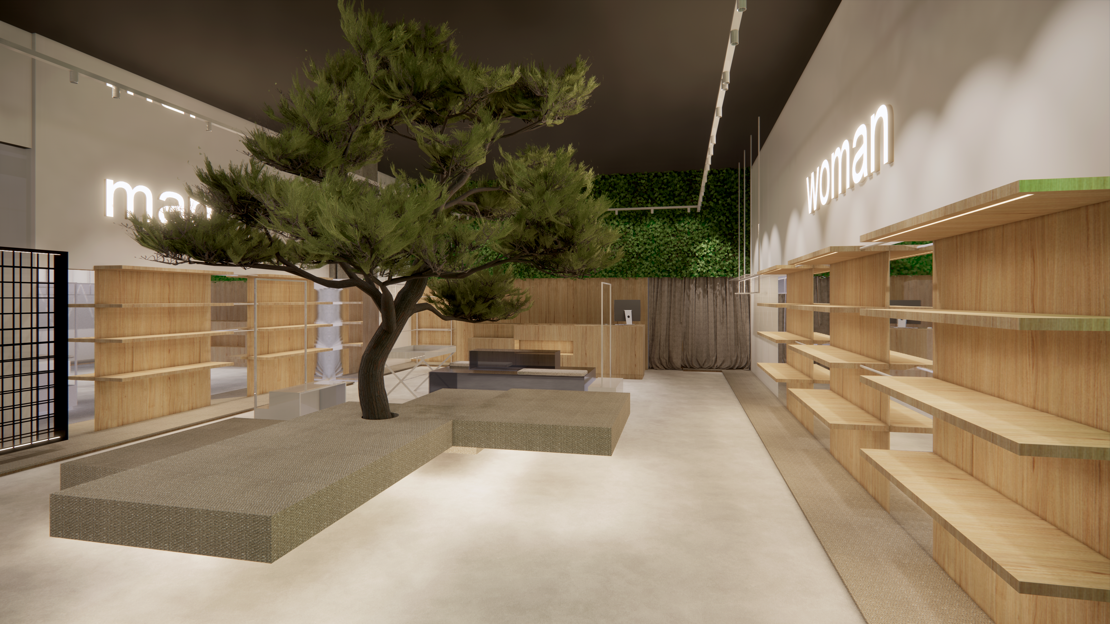 Esto se consiguió mediante el uso de elementos naturales como los postes de madera, las estanterías, también de madera, las alfombras en tonos tierras, o el uso de paredes vegetales en el interior de las tiendas.